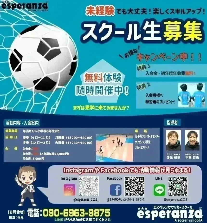 岩手県紫波町を拠点に活動しているエスペランササッカースクール 代表兼コーチを務めさせて頂いてます、寺光峰竜(ジコウ ミネタツ)と申します。兵庫県の神戸弘陵高校を卒業後、バンディオンセ神戸に入団、その後20歳で地元兵庫を離れ岩手県にありますガンジュ岩手に所属し26歳まで社会人チームで現役生活をおくらせていただきました。