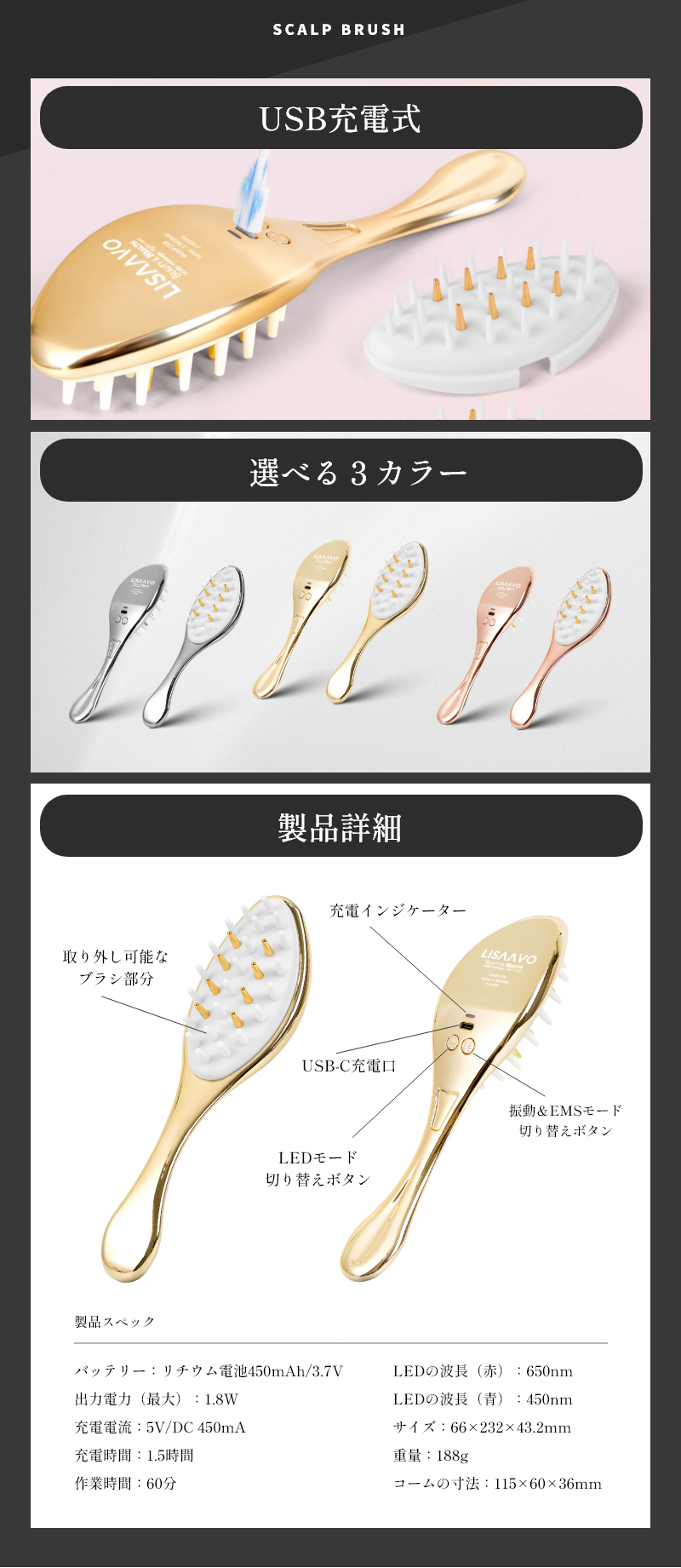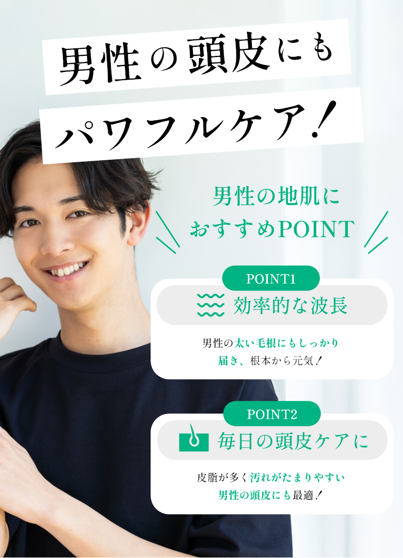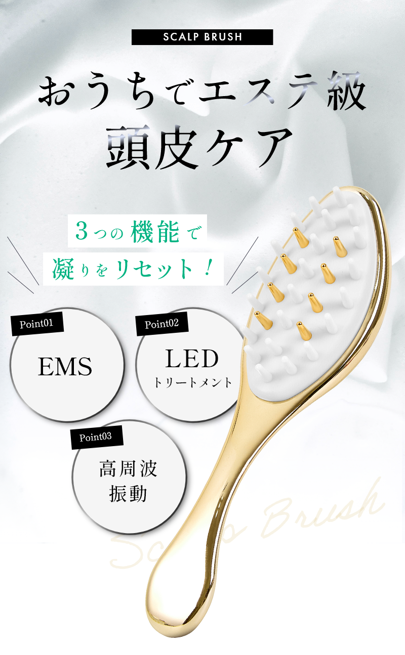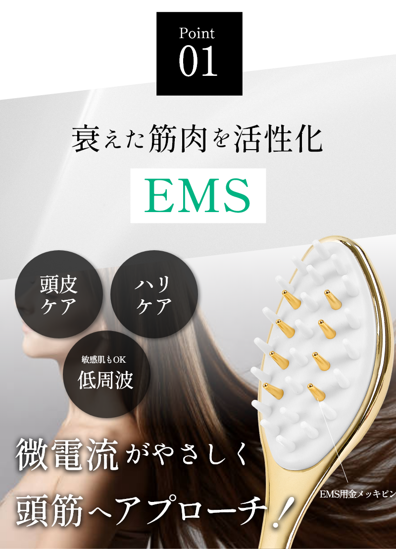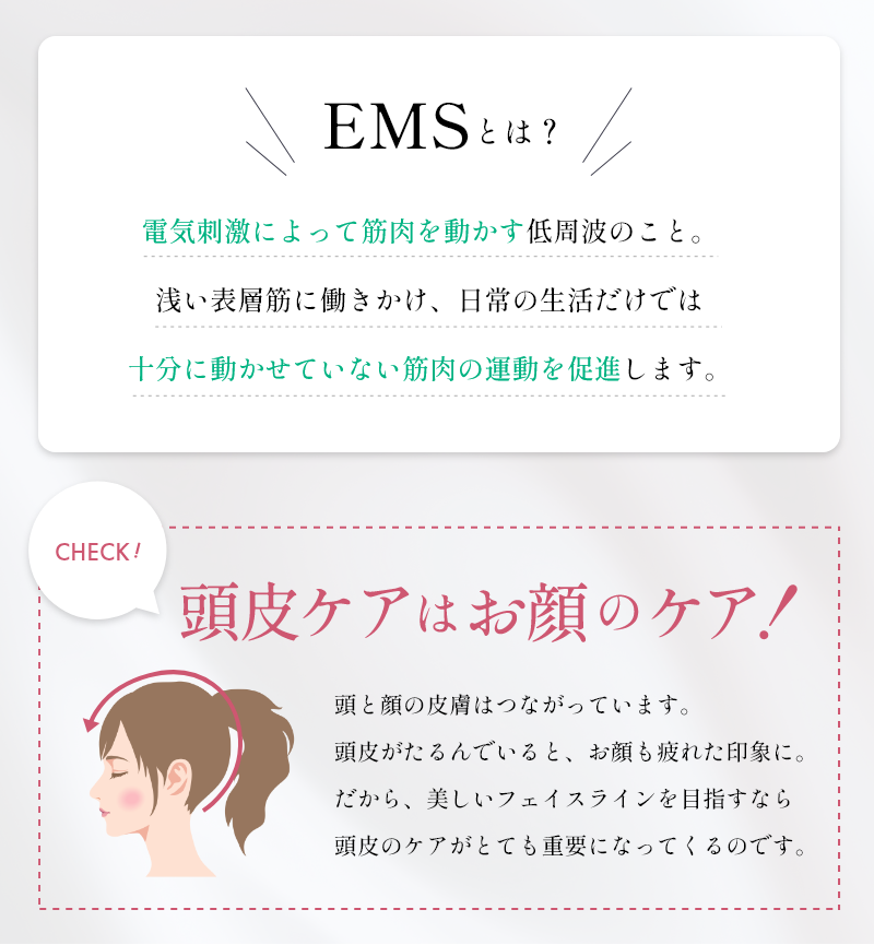 ※EMS(微弱電流刺激)は頭皮が弱い人は痛みを感じます。その際は使用を中止してください。