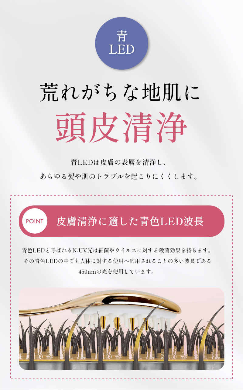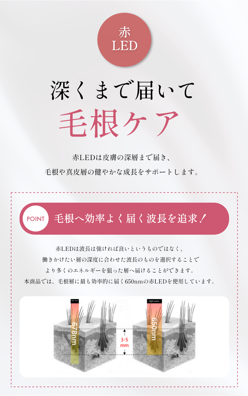 A:赤色光は、毛根を刺激して髪の成長を促し、血行を改善することで頭皮の健康を向上させます。青色光は炎症を抑え、細菌と戦う効果があり、頭皮のニキビなどの状態に有益です。