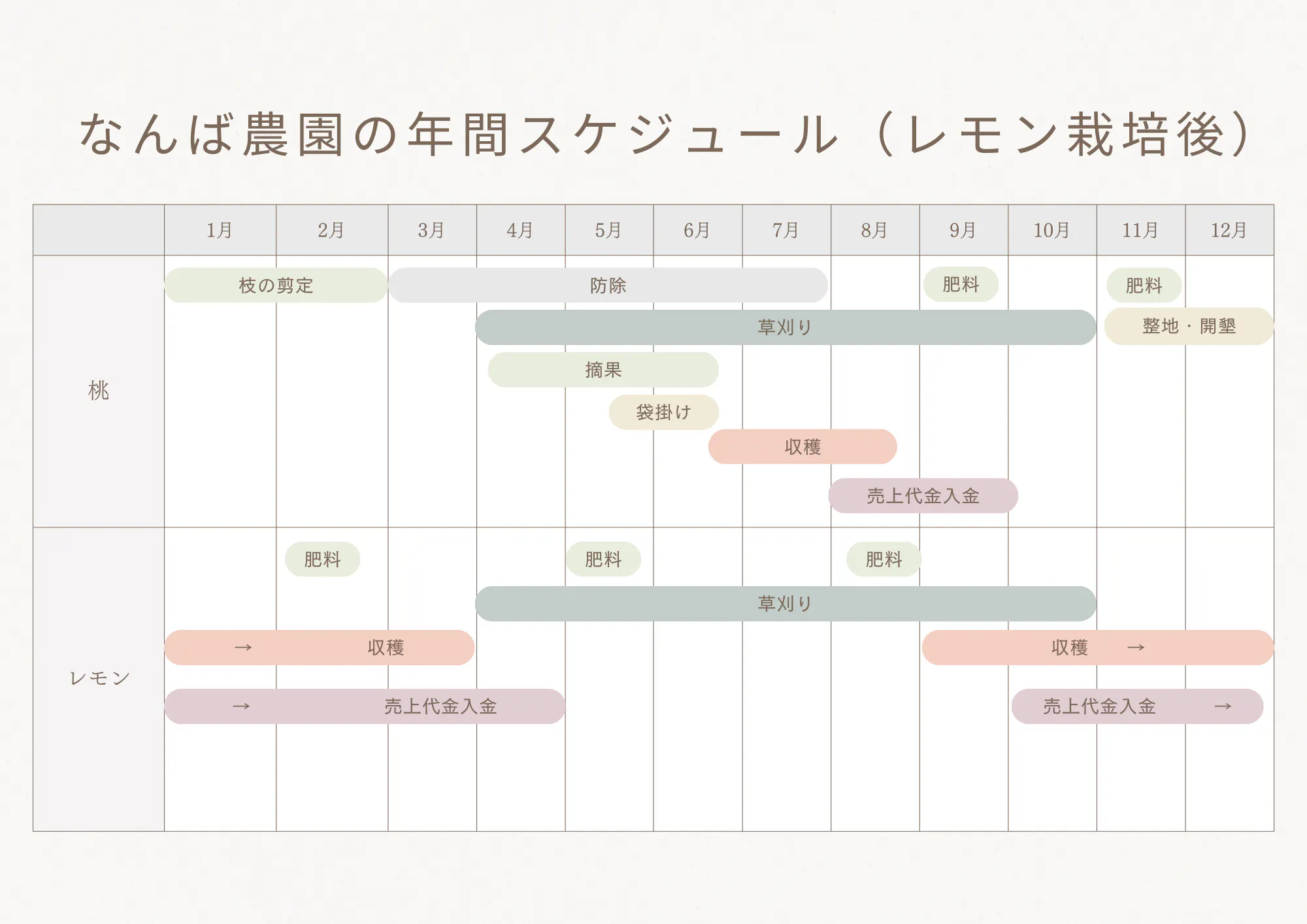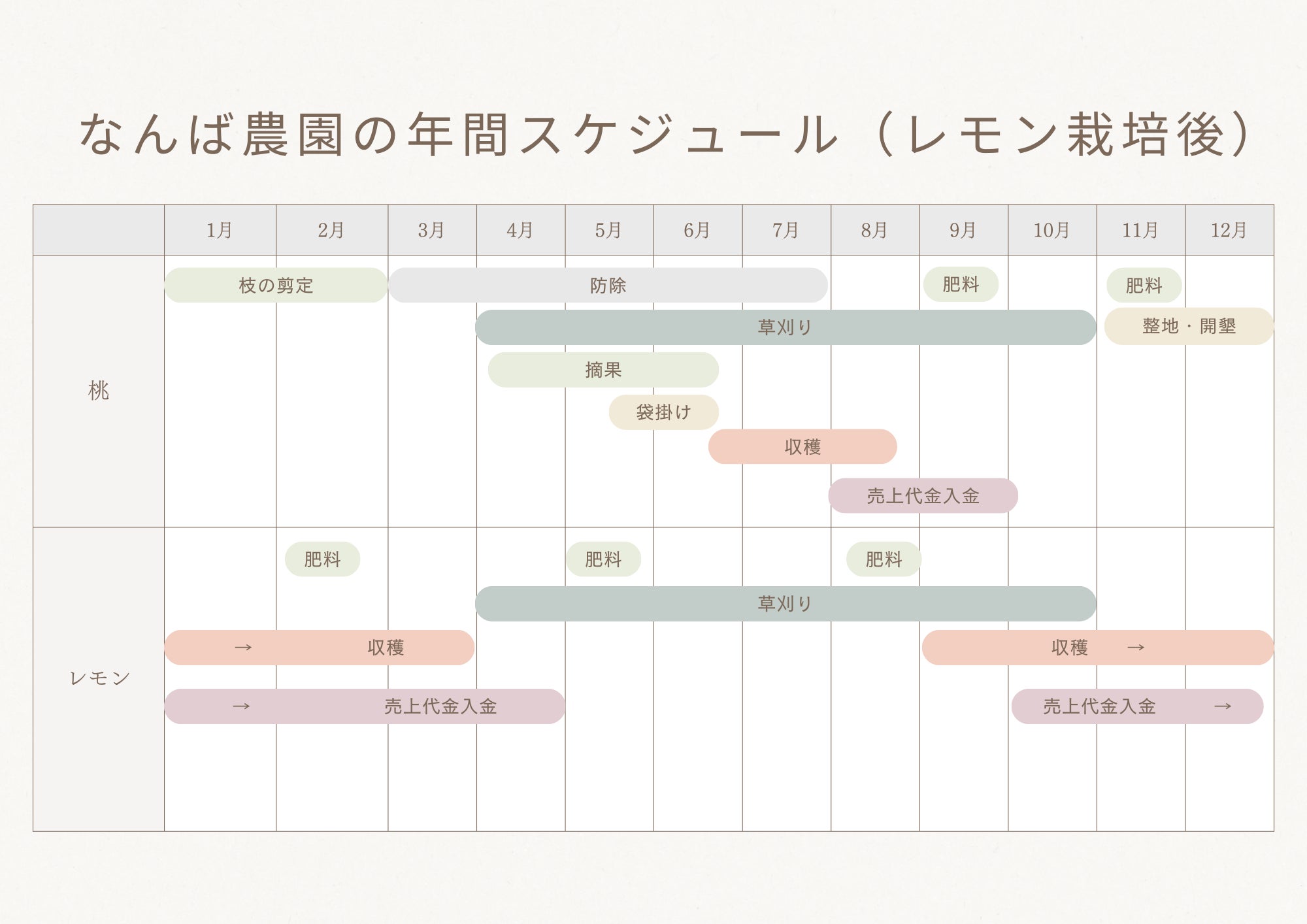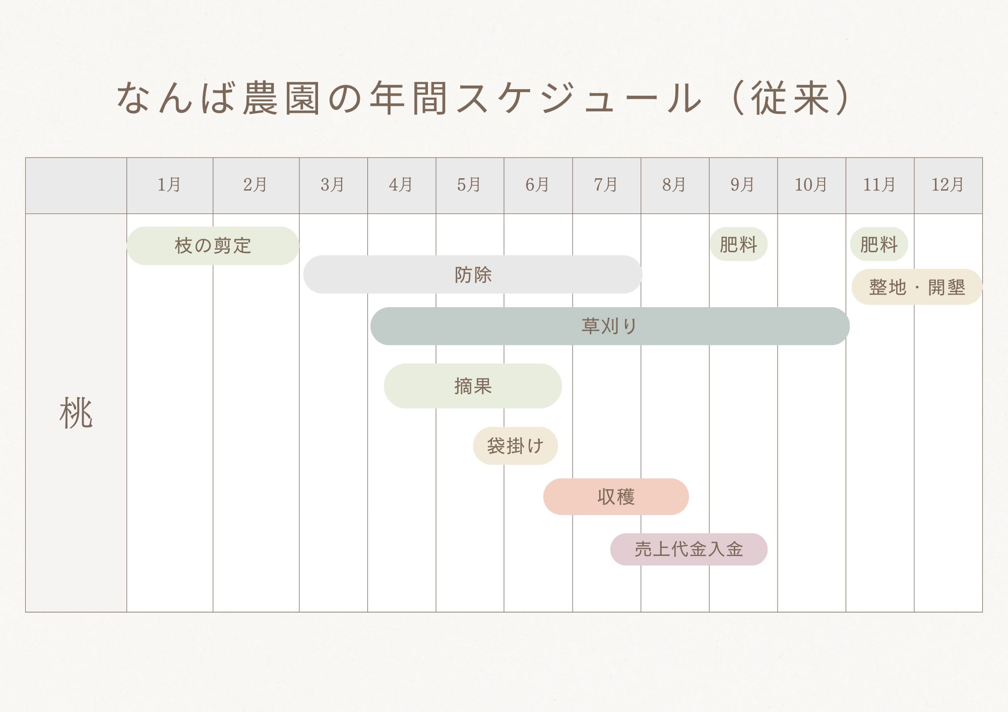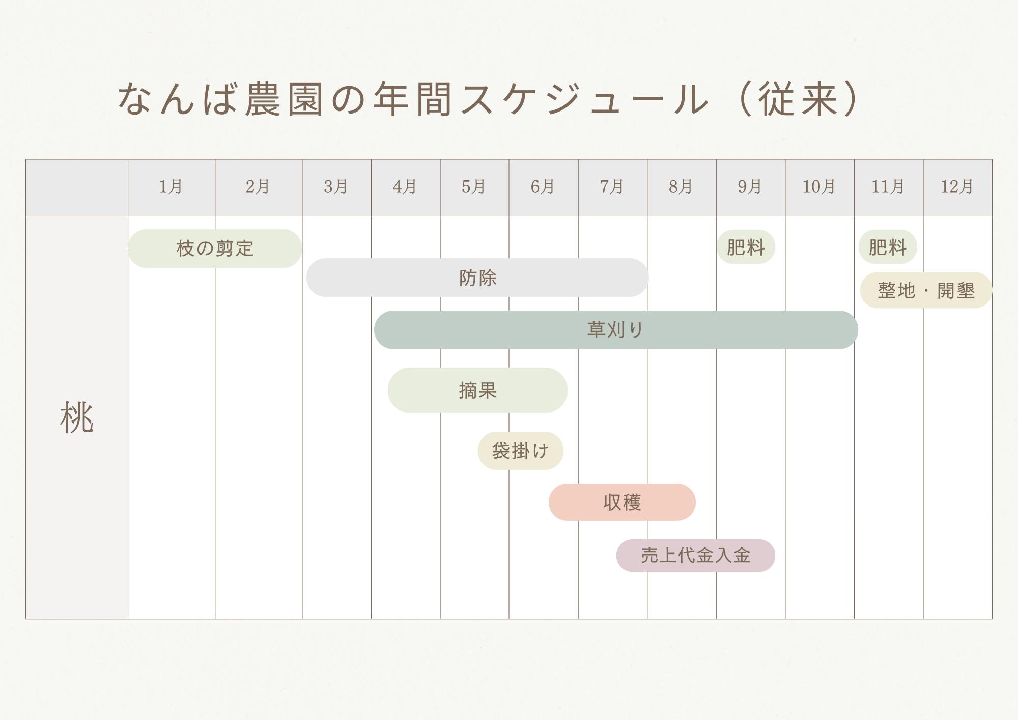 なんば農園に限らず農家には共通の悩み、苦悩があると思います。それは、労働時期の集中であると思います。当園に限っていえば、桃は収穫期の6月~8月が繁忙期と言われ、その期間は人の手を借りてまで収穫を行う必要があります。1日でも収穫が遅れれば、過熟果となり商品にはなりません。つまり、年間を通して猛烈に忙しい時期が決まっている、ということです。それは即ち、年間を通して収入がある時期も決まっている、ということにもなります。特に白桃に限って言えば、1つの品種の収穫時期は1週間ほどです。多品種栽培しリレー出荷したとしても3か月程度で収穫が終わってしまいます。したがって、【多くの農家は労働集中期と収入時期は限られている】と言えます。なんば農園も例外ではありませんでした。従来は桃のみの栽培でしたので、8月以降になると、管理作業だけになる為、ゆったりと自分のペースで仕事を進めれます。最終の桃の売上代金が9月までに入ってきます。そのお金で、翌年の6月までの生活費に充てなければなりません。要するに、6月までは無収入の状態で生活していくことになります。