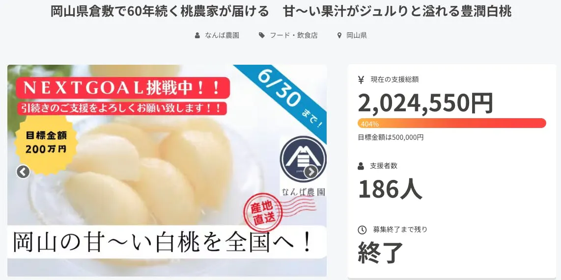 2025/04/15 15:07皆様こんにちは!!岡山の白桃農家、なんば農園でございます。御無沙汰しております。昨年の白桃プロジェクト~レモネードプロジェクトでは、多大なる応援、ご支援を賜りまして、誠にありがとうございました。昨年は当園の白桃を186人もの方々へお届けでき、大変嬉しく思います。現在の農園は、満開の桃の花が散り始め、摘果、摘蕾、草刈りと、既に繁忙期へ突入しており、昨日から今日にかけて2日間、町内の川掃除に従事し、時折降る雨の中、町内美化に勤しんでおりました(笑)。そしてこの度、皆様からの熱いご要望にお応えすべく、【“桃づくし”の夏、再び。清水白桃から、旬の食べ比べ便。岡山・なんば農園2025!】と題しまして、<2ndシーズン>を開幕することとなりました!2ndシーズンでは、さらに皆様に喜んでいただけるよう、リターン品の内容をバージョンアップさせていただきました!つきましては、2ndシーズンも皆様と共に歩んでいきたいと考えておりますので、引き続きのご支援・ご声援を賜りますようお願い申し上げます!!下記リンクより、プロジェクトページの閲覧が可能となっております。是非プロジェクトページをご覧いただき、お気に入り登録をお願いできればと思います。https://camp-fire.jp/projects/837446/view もっと見る