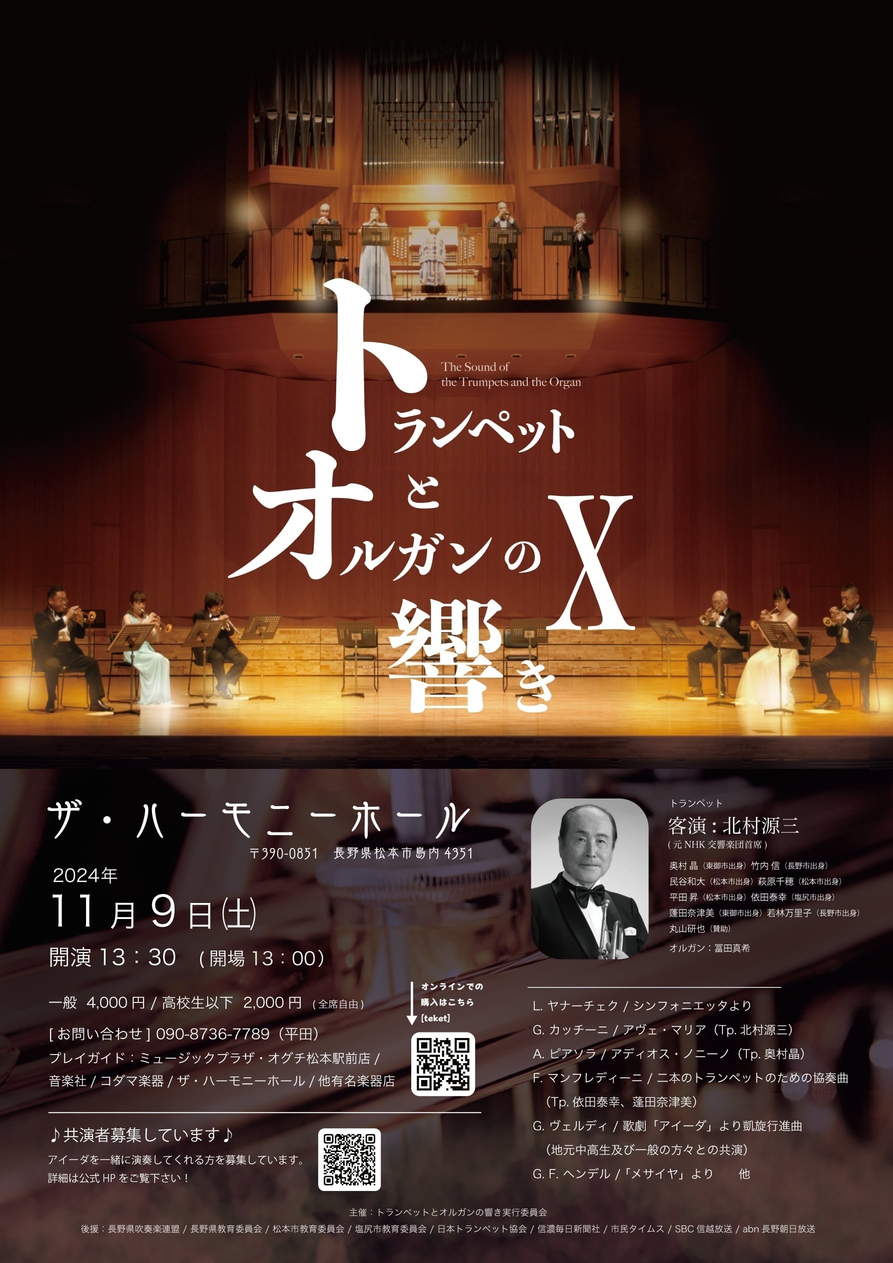 私たちは、「トランペットとオルガンの響き実行委員会」と申します。長野県在住のトランペット奏者平田昇氏の提唱により、「⻑野県出身のプロトランペット奏者の親睦と出身地への貢献」を目的に1997年に結成されました。長野県出身で日本の音楽界の第一線で活躍するプロのトランペット奏者と、世界的にも屈指の響きを誇る松本市音楽文化ホールのパイプオルガンによるコンサート「トランペットとオルガンの響き」を1997年以来10回に渡り企画運営して参りました。初開催時より、「長野ではなかなか聴けない本物のトランペットの響きを満喫できた」と多くの方々から好評を頂いております。