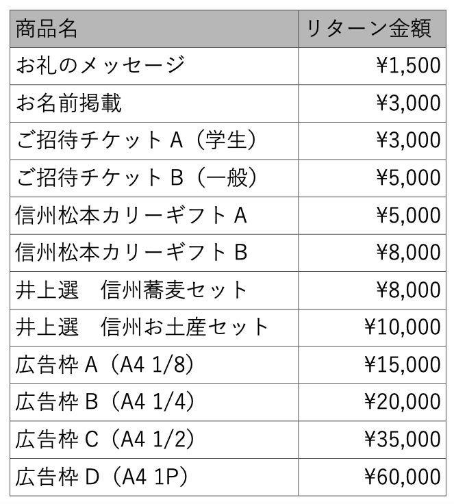 コンサートを少しでも良いお席でお楽しみになれるよう、リターン限定の「ご招待席」をご用意致しました。また以前から、大変魅力的なコンサートで応援したいけど松本までは行けない・・・というお声もたくさん頂いております。今回は松本市の老舗百貨店、井上百貨店様にご協賛頂き、実際に松本に足を運ばなくても信州松本の魅力をたっぷりと感じて頂けるようなリターンもご用意致しました。