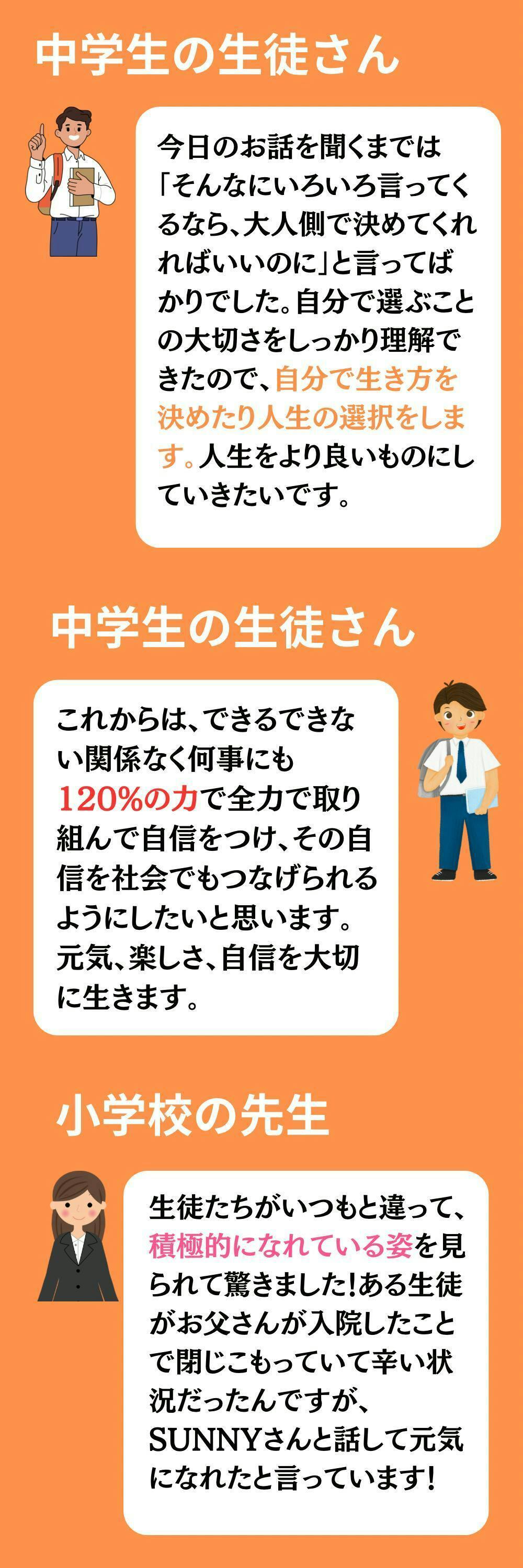 「SUNNYさんの言っていることはまさにそうなんです!"チャレンジしよう"と伝えているんですが、私たちではなかなか生徒の心に届けられないんですよ・・・」