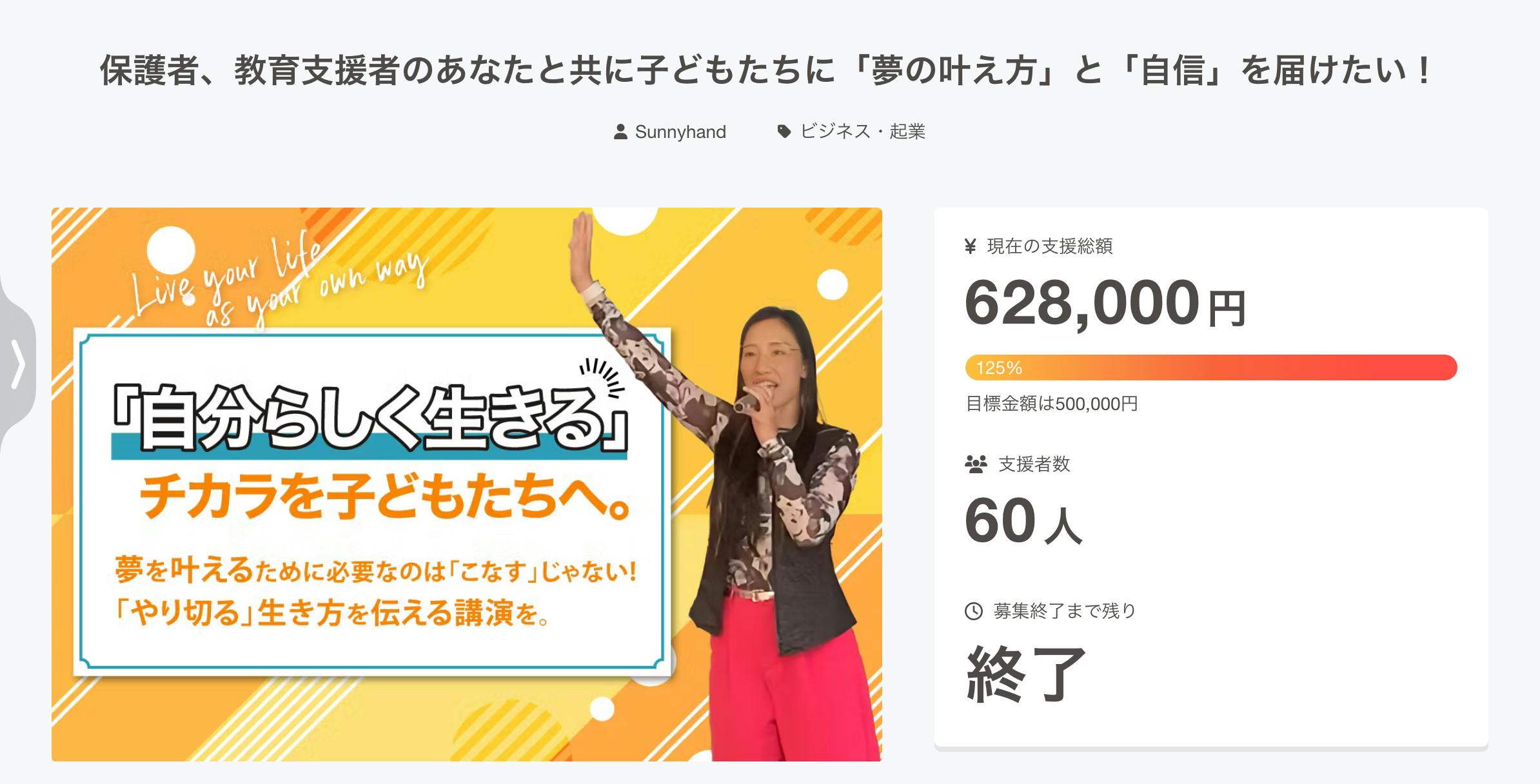 2025/01/06 09:13このたび実施したクラウドファンディングは、皆さまの温かいご支援のおかげで、最終金額628,000円を達成することができました!心からの感謝を申し上げます。本当にありがとうございました。このプロジェクトを通じて、多くの方が「子どもたちに自信と夢を叶える力を届けたい」という私の想いに共感し、応援してくださったことに大きな勇気をいただきました。皆さまからいただいたご支援は、講演活動の拡大や教材制作、移動費など、1万人の子どもたちに「夢を叶える方法」と「教わり上手」の大切さを伝えるために、大切に活用させていただきます。これからも、より多くの子どもたちに「自信」と「夢を追いかける力」を届けるため、活動を続けてまいります。皆さまと一緒に未来を育むこの挑戦を、引き続き温かく見守っていただければ幸いです。本当にありがとうございました!皆様のご支援ご協力大変感謝しております。2025年1月5日サニーハンド 代表 小川陽子 もっと見る