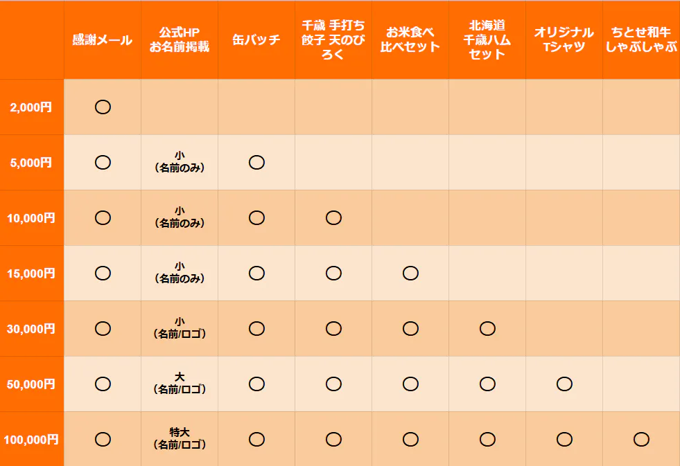 応援していただいた皆様には、千歳市の特産品やオリジナルグッズなど、