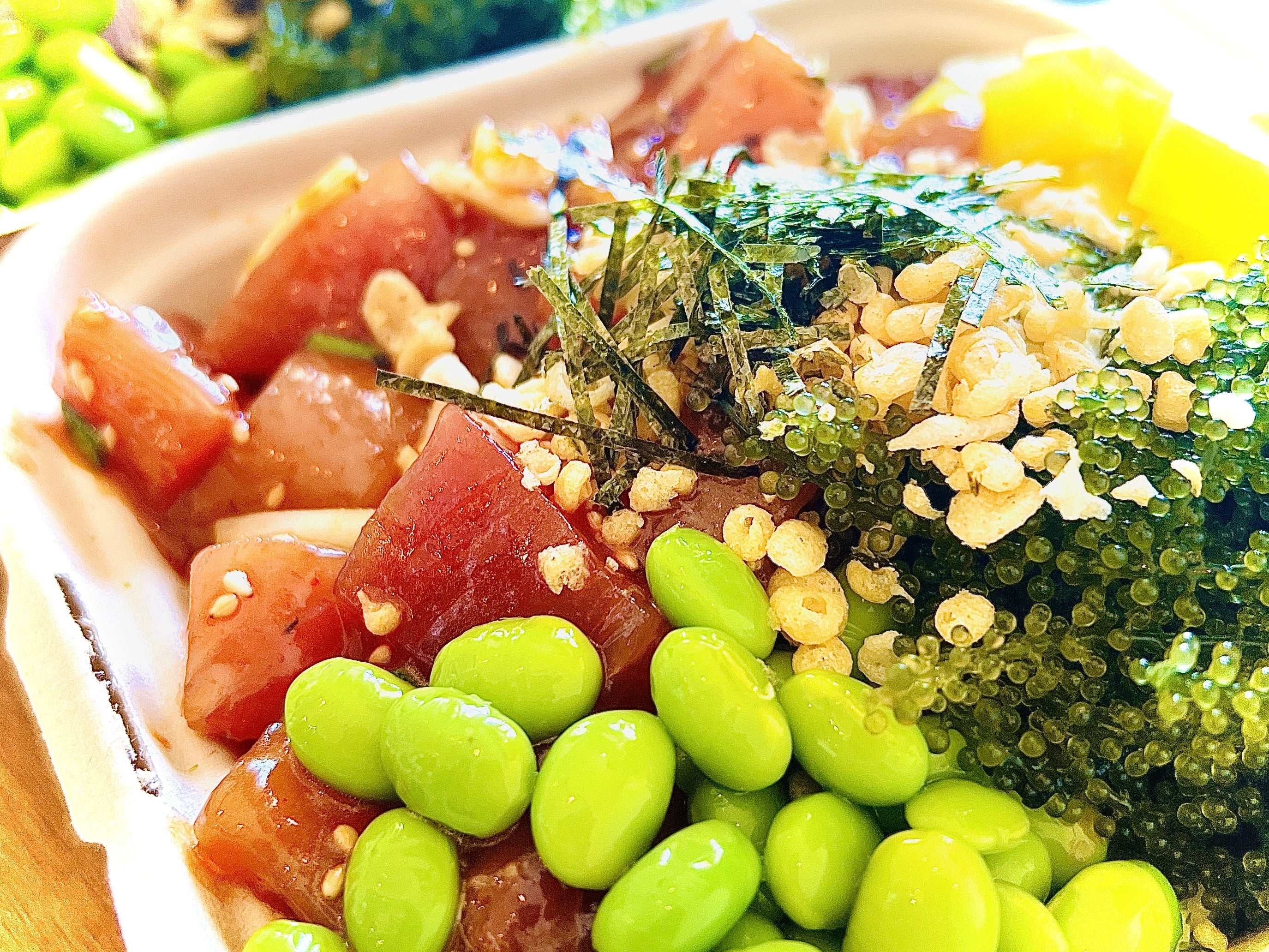 聞くところによると、美味しいお店では毎朝市場に買い付けに行き、獲れたてをそのままポキにしているそう。そう、"生"なんです。だから、プリっプリで臭みのない、あれほど美味しいポキが提供できるのです。加えて、選べる様々なソース。甘みのある醤油味から、トビコの触感が楽しいクリーミーなもの、ごま油と塩だけのシンプルなものまでバリエーションが豊富で食べ飽きることがない。