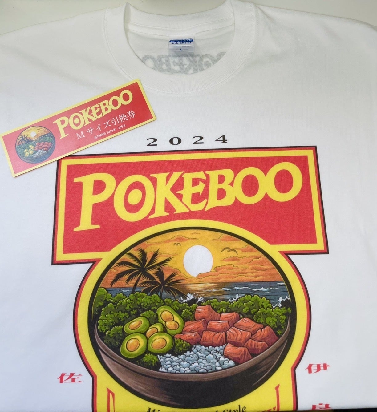 ⑤100,000円 内容 : お礼のお手紙+ポキMサイズ引換券×15枚+POKEBOOステッカー×15枚+POKEBOO Tシャツ×2枚+"POKEBOOサポーター"として店舗内壁面にお名前掲載(大サイズ)+カツオ捌き体験