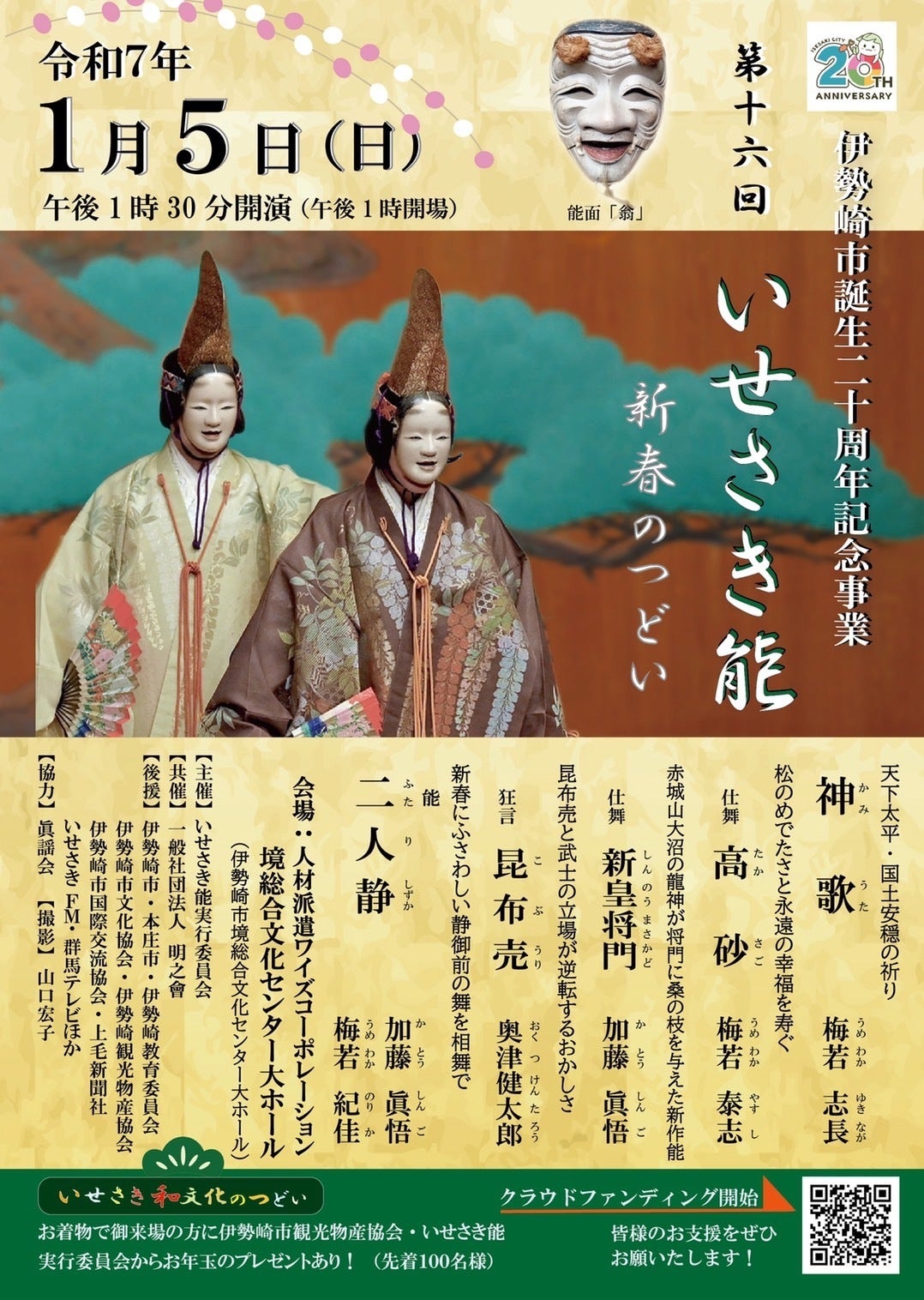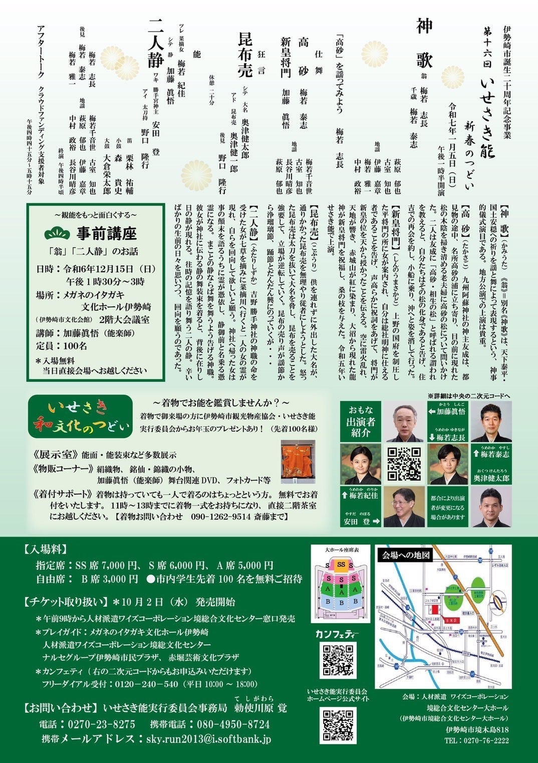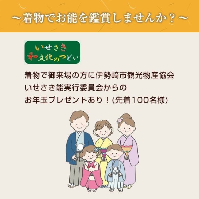 令和7年1月5日(日)に第十六回いせさき能 新春のつどいを開催いたします。この公演をたくさんの方に観ていただいて、良い新年を迎えていただきたいと思います。当日はいせさき市内の学生さん100名を無料招待、絹織物・銘仙・錦織小物の展示、着付け無料サービスも実施します。応援をよろしくお願いします。