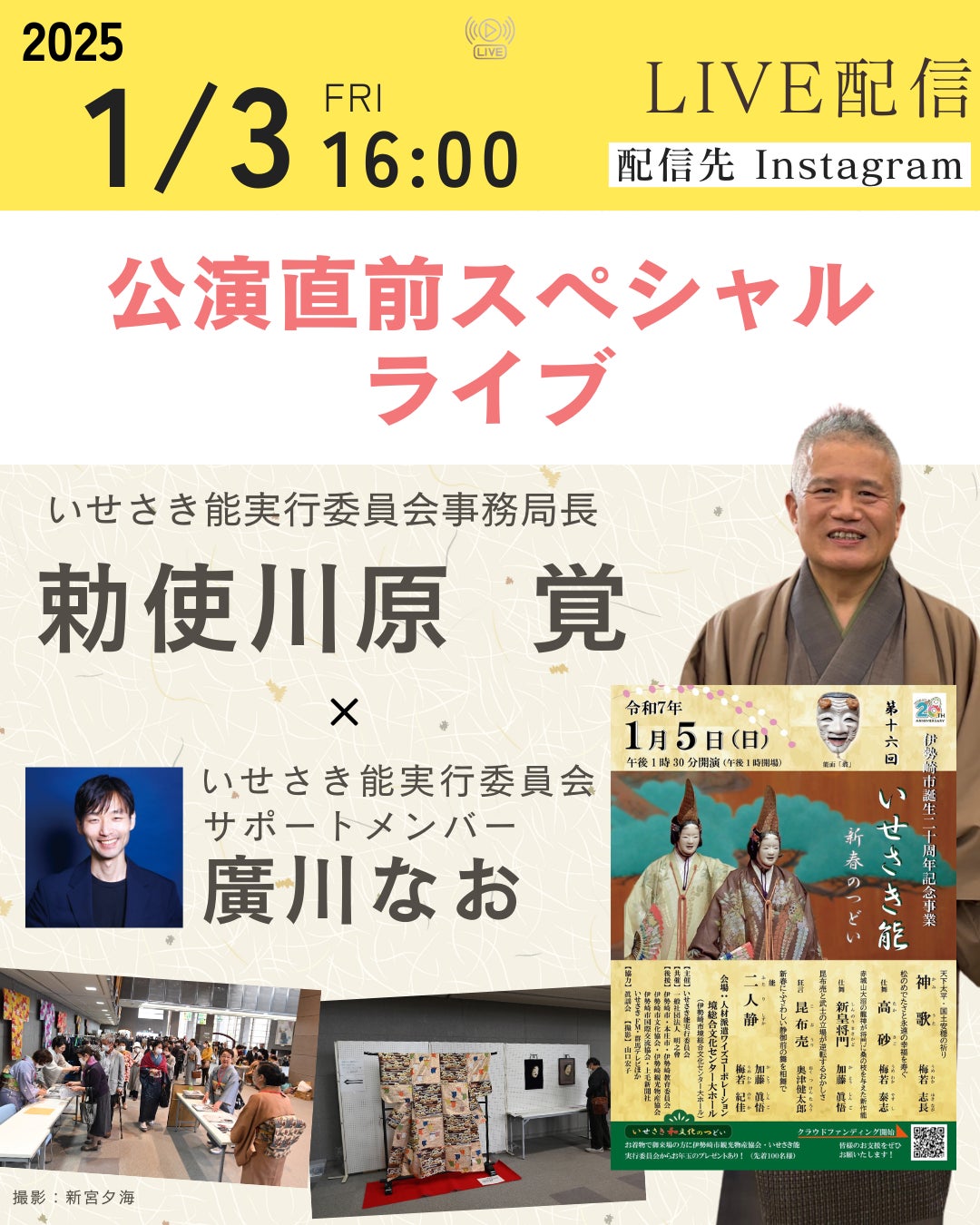 • 明けましておめでとうございます。本年もよろしくお願いいたします2025年のお正月はいかがおすごしでしょう。ご家族でゆっくりされていますか??第16回いせさき能の公演はいよいよ1月5日(日)になります!!というわけで!!公演直前スペシャルライブを行います!ーーーーーーーーーーーーーーーーーーーー【ライブ配信】 1月3日(金)16時から配信先: https://www.instagram.com/teshigawara.s/https://www.instagram.com/isesakinou/ーーーーーーーーーーーーーーーーーーーーいせさき能実行委員会事務局長 勅使川原覚、サポートメンバー廣川なおの2人で行います。ぜひ遊びに来て下さい!お正月のこと、公演の見どころ、チケットや公演準備の状況などなどをお伝えいたします!コメント参加もお待ちしておりますーーーーーーーーーーーーーーーーーーーー~お知らせ~☆いせさきFMに出演いたしました☆https://creators.spotify.com/pod/show/isetama/episodes/ep-e2ss5p4/a-abn1a72【公演情報】第16回いせさき能 新春のつどい日時2025年1月5日 (日)13:30 場所伊勢崎市境総合文化センター演目『神歌』梅若志長 梅若泰志仕舞『高砂』梅若泰志仕舞『新皇将門』加藤眞悟狂言『昆布売』奥津健太郎 奥津健一郎能『二人静』加藤眞悟 梅若紀佳チケットconfetti-web.com/events/3562公式HPhttps://isesakinou.amebaownd.com/公式Instagramhttps://www.instagram.com/isesakinou/Xhttps://x.com/isesakinou もっと見る