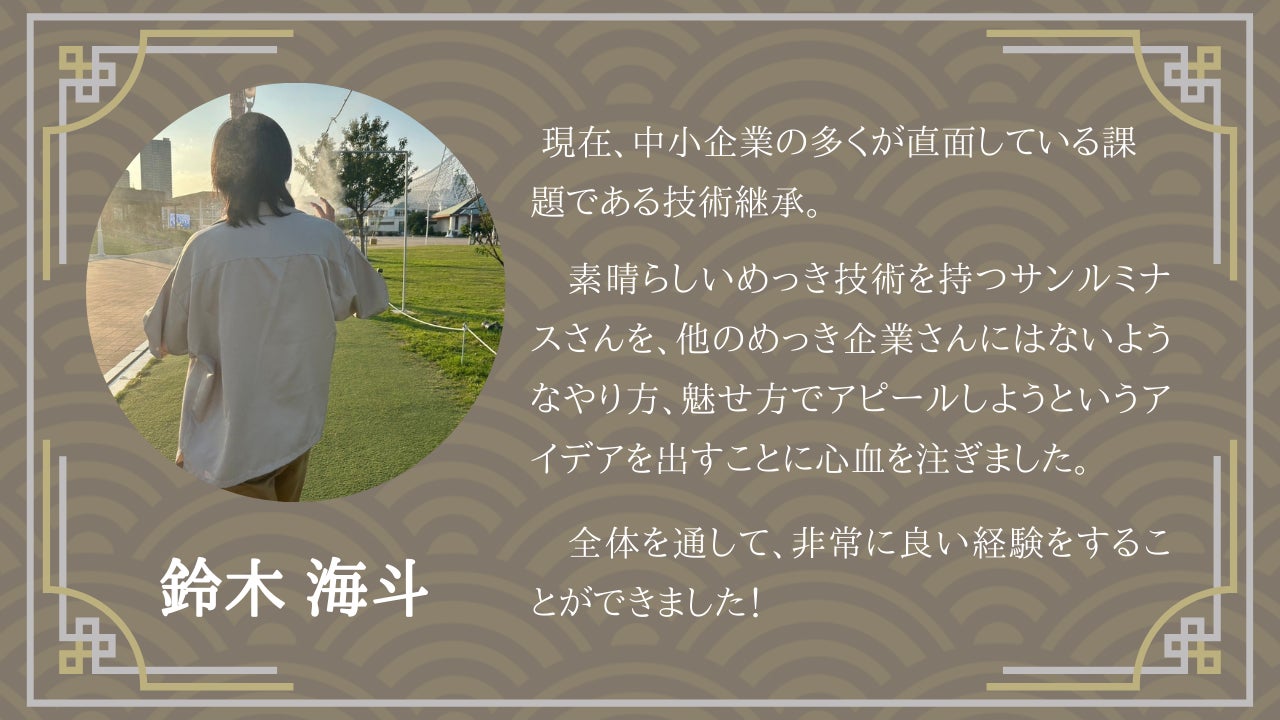 元々下請けが多いめっき業としては、新しいモノを作り、生み出すことが苦手な面があります。ですので、その辺りを学生さんたちに任せることにしました。学生さんたちにとってこのインターンが良い経験となれば、という想いもあります。」