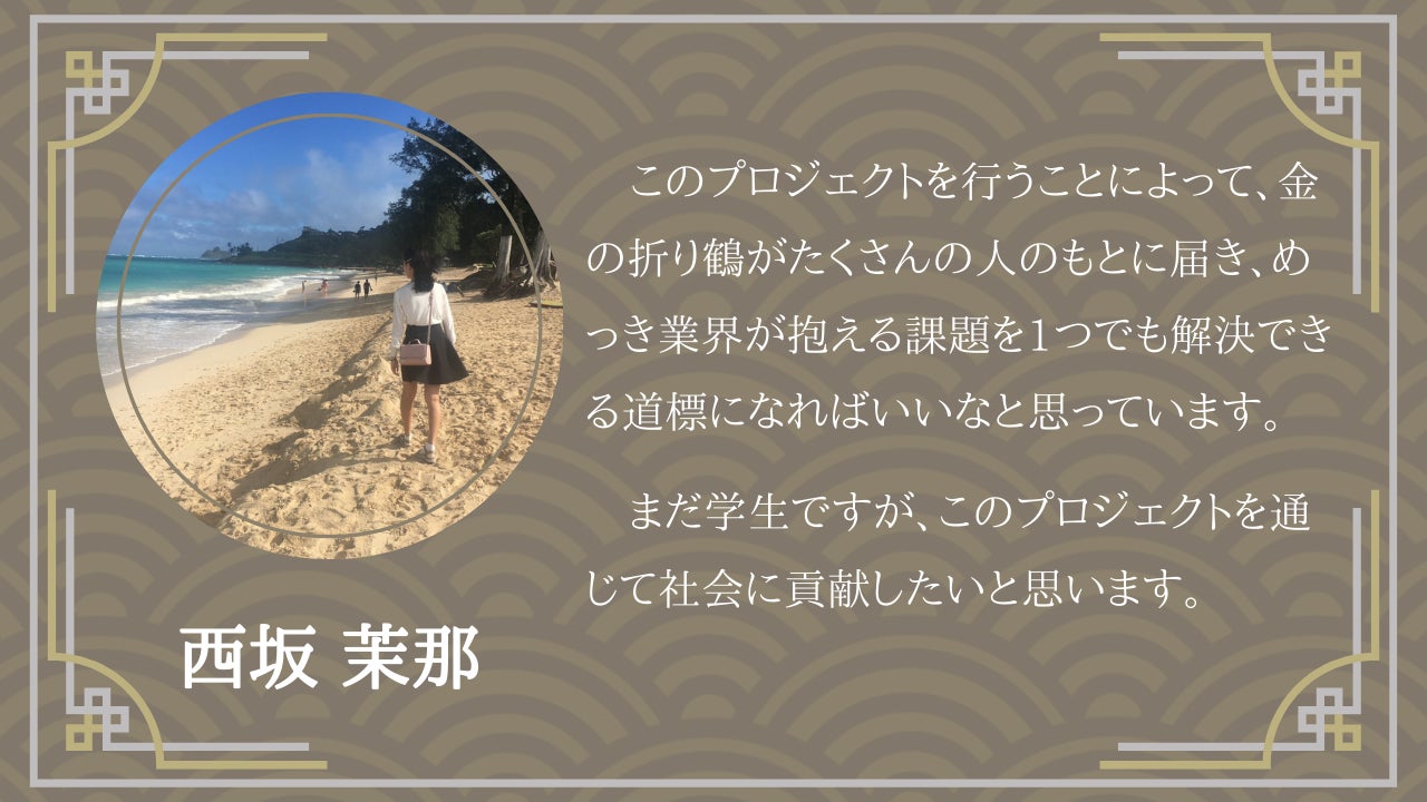 「金の折り鶴は一つ一つ手作りで、サンルミナスの技術が詰まっており、めっきの温かみを直に感じて頂ける製品となっています。今回の製品を通してめっきの魅力を多くの方に届けると共に、業界全体に活気を取り戻す第一歩となれば、と思います。めっきのイメージを一新して、めっき技術を継承する職人を志す人が増えたらより嬉しいです。」