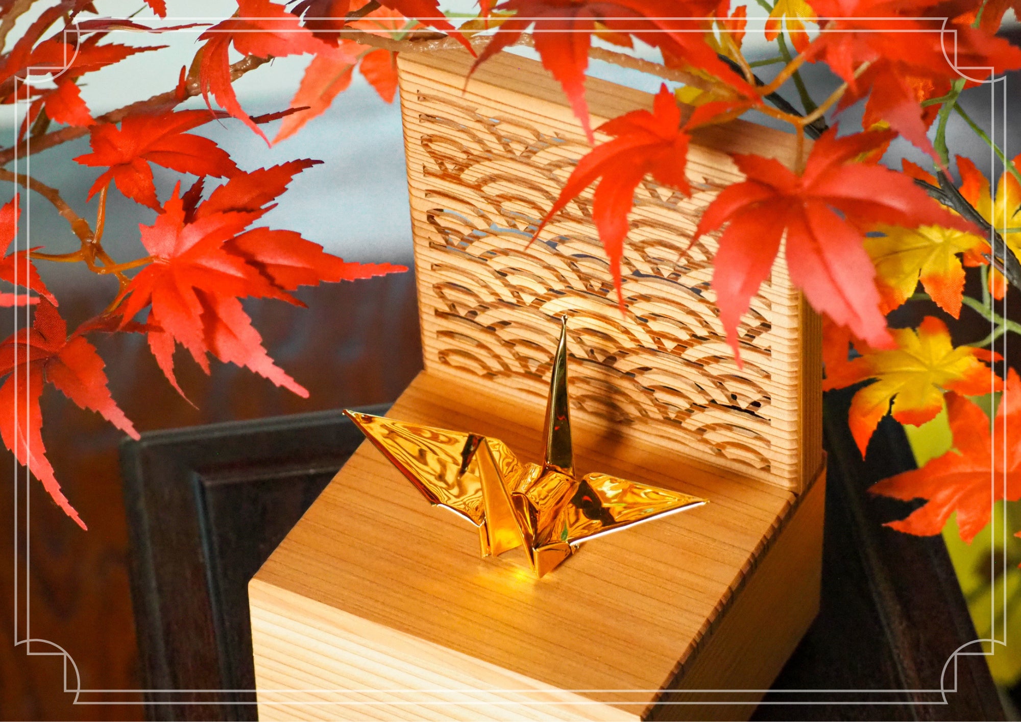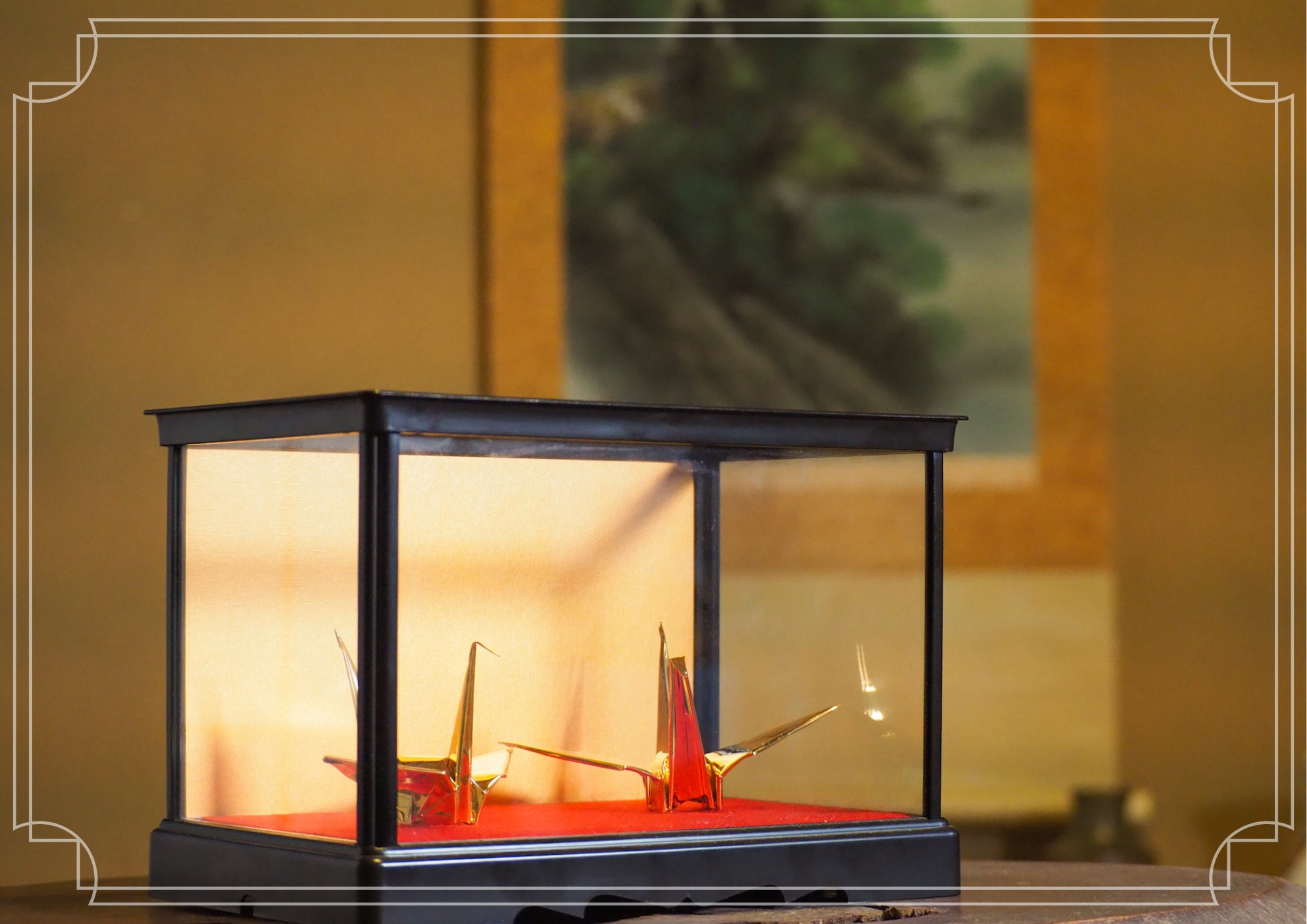 透かし彫りを施した高級感のある箱とともに折り鶴をお届けします。
