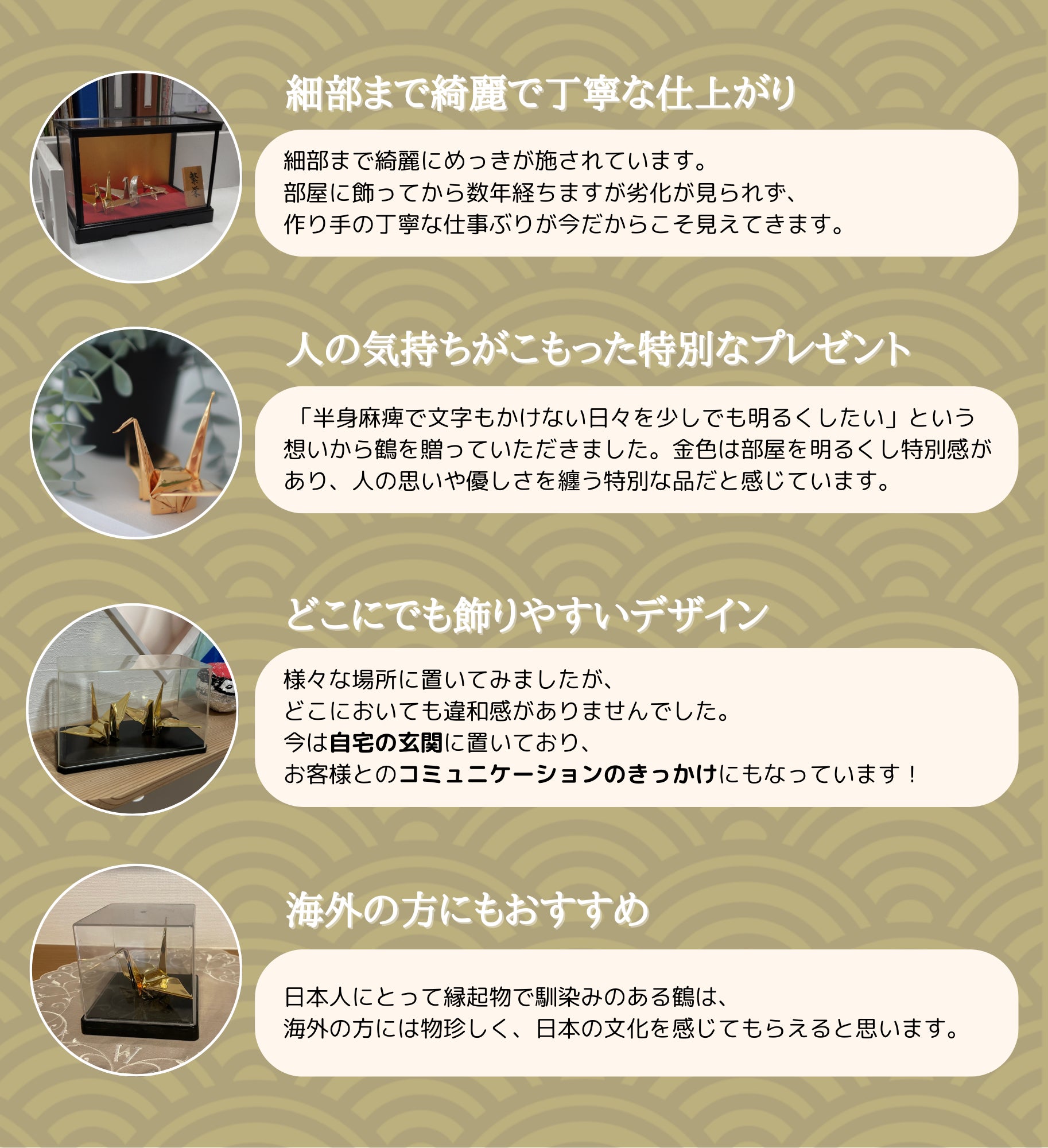 ・折り鶴は一つ一つ手作業で制作をしているため、出来栄えに多少のばらつきがございます。
