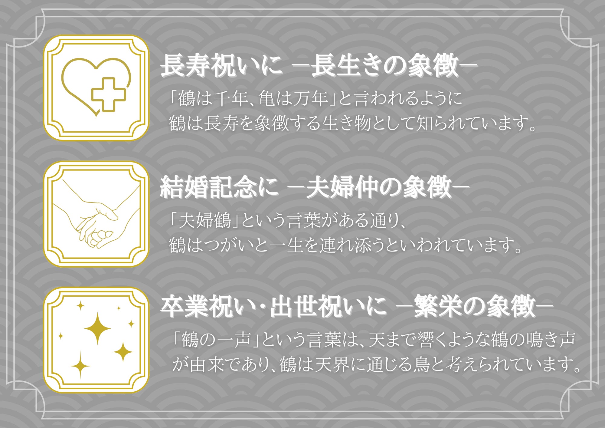 鶴は古来より縁起の良い鳥とされています。様々な意味合いが込められており、様々な場面で贈り物として大切な方に想いを伝えることができます。