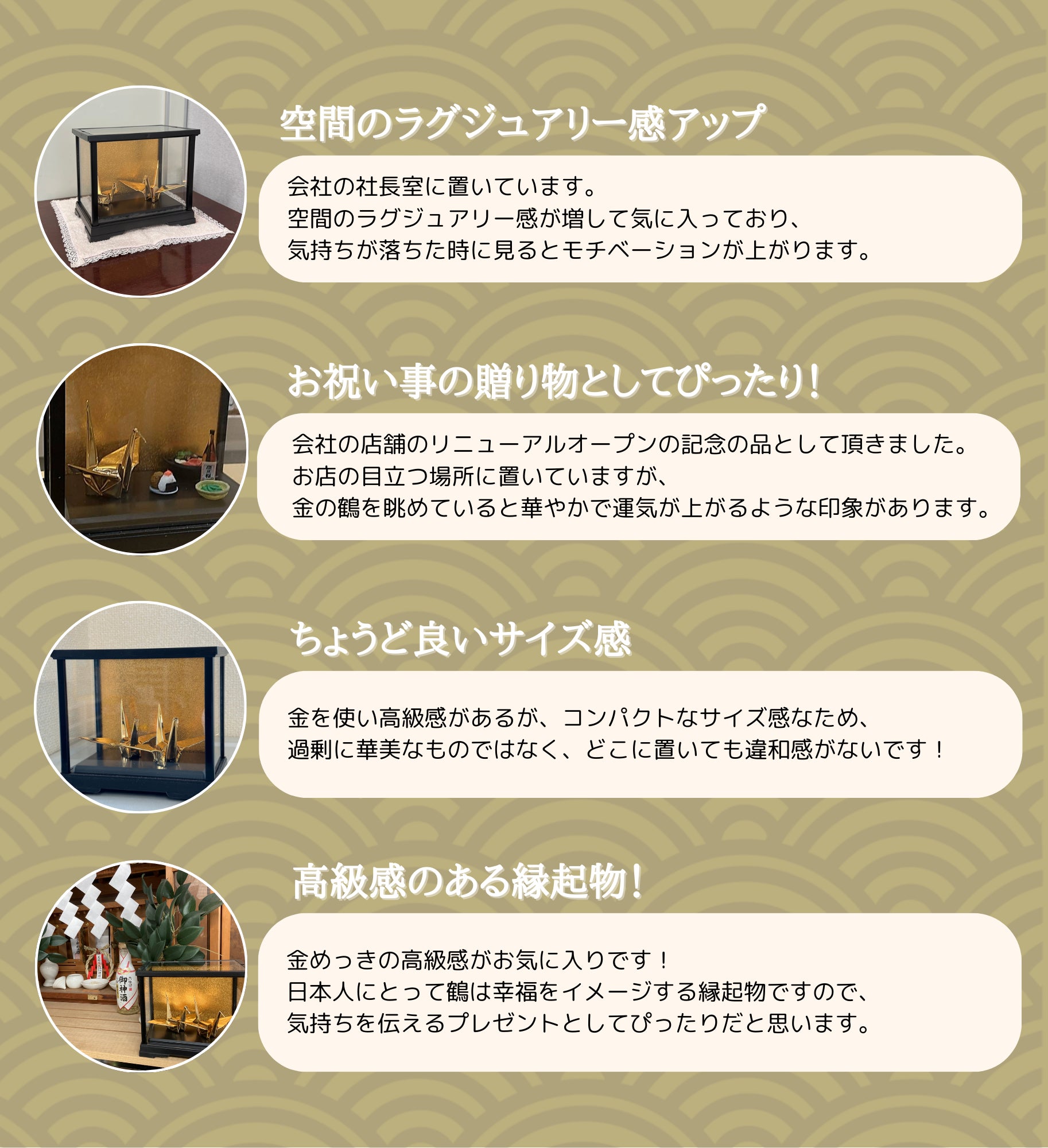 金色に輝く煌びやかな縁起物の鶴が、空間や気持ちに彩りを与えます。