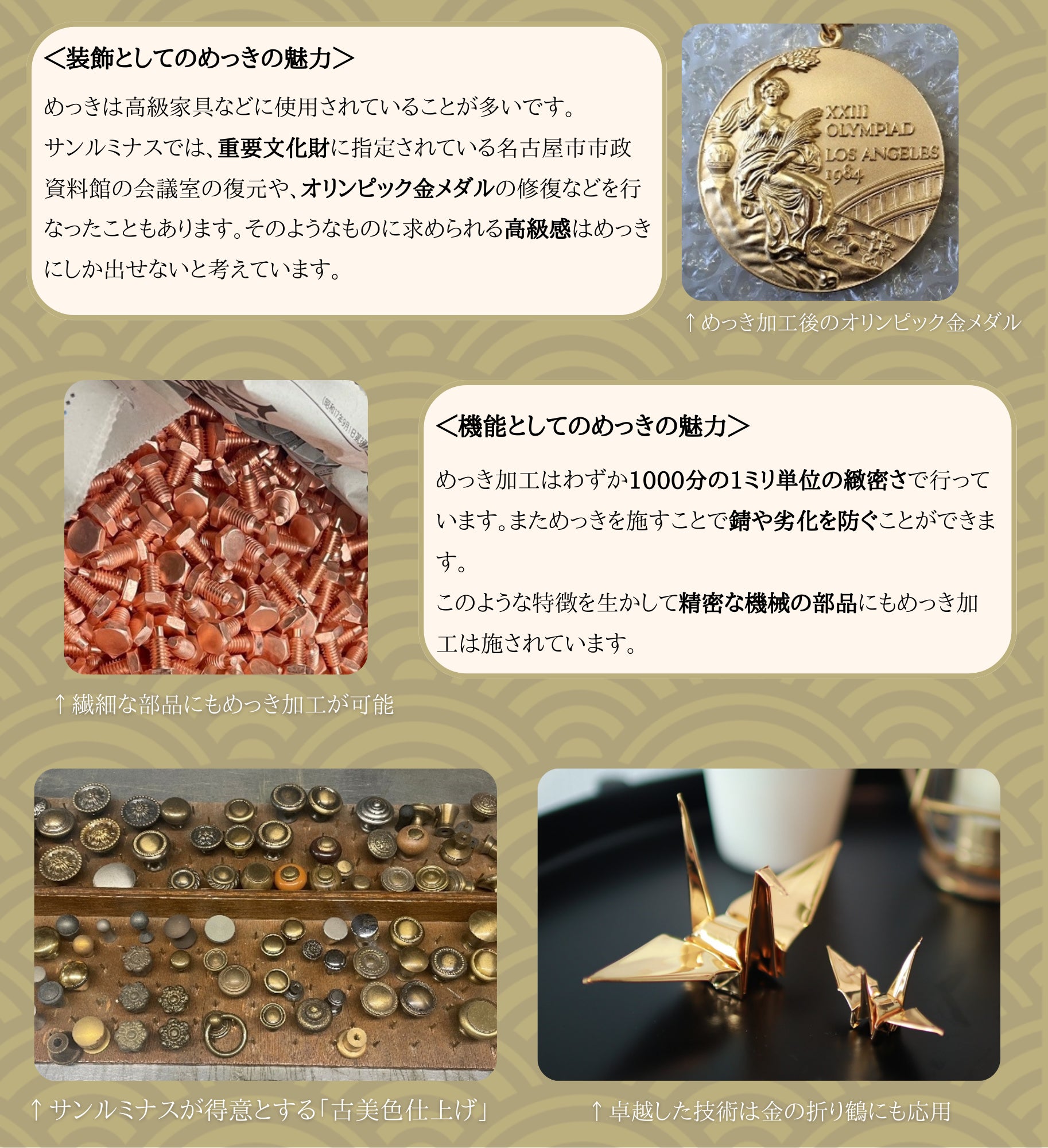 私たち有限会社サンルミナスは70年を超える歴史の中でめっき加工の腕を磨き上げてきました。わずか1000分の1mm単位の繊細な薄膜で、鮮やかな色見を出す優れためっき職人の技術は重要文化財の復元などにも用いられています。