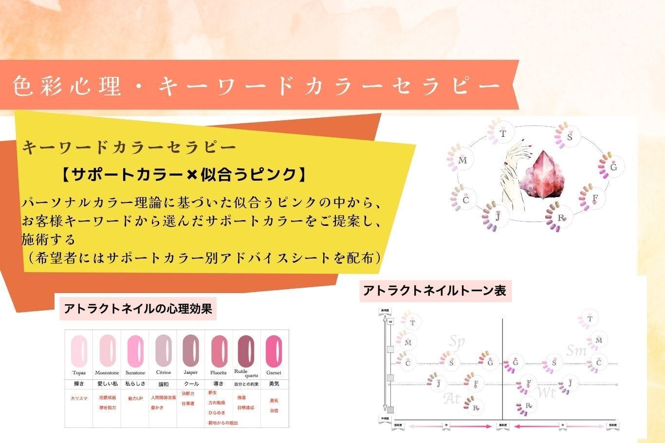 アトラクトネイルは、単なる流行や好みに左右されるネイルではなく、心理的効果をふまえた色選びにより、施術そのものが“自己肯定感を高める体験”となるのが特長です。