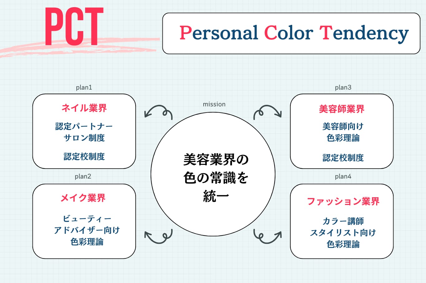 私たちは、ネイル2.0時代を生きるネイリストのために、「色彩理論」と「ネイルのパーソナルカラー」を融合した新たな理論【PNCT(Personal Nail Color Tendency)】(パーソナルネイルカラー傾向)を確立しました。これにより、お客様一人ひとりの魅力を引き出し、心まで満たされるネイル提案が可能となります。