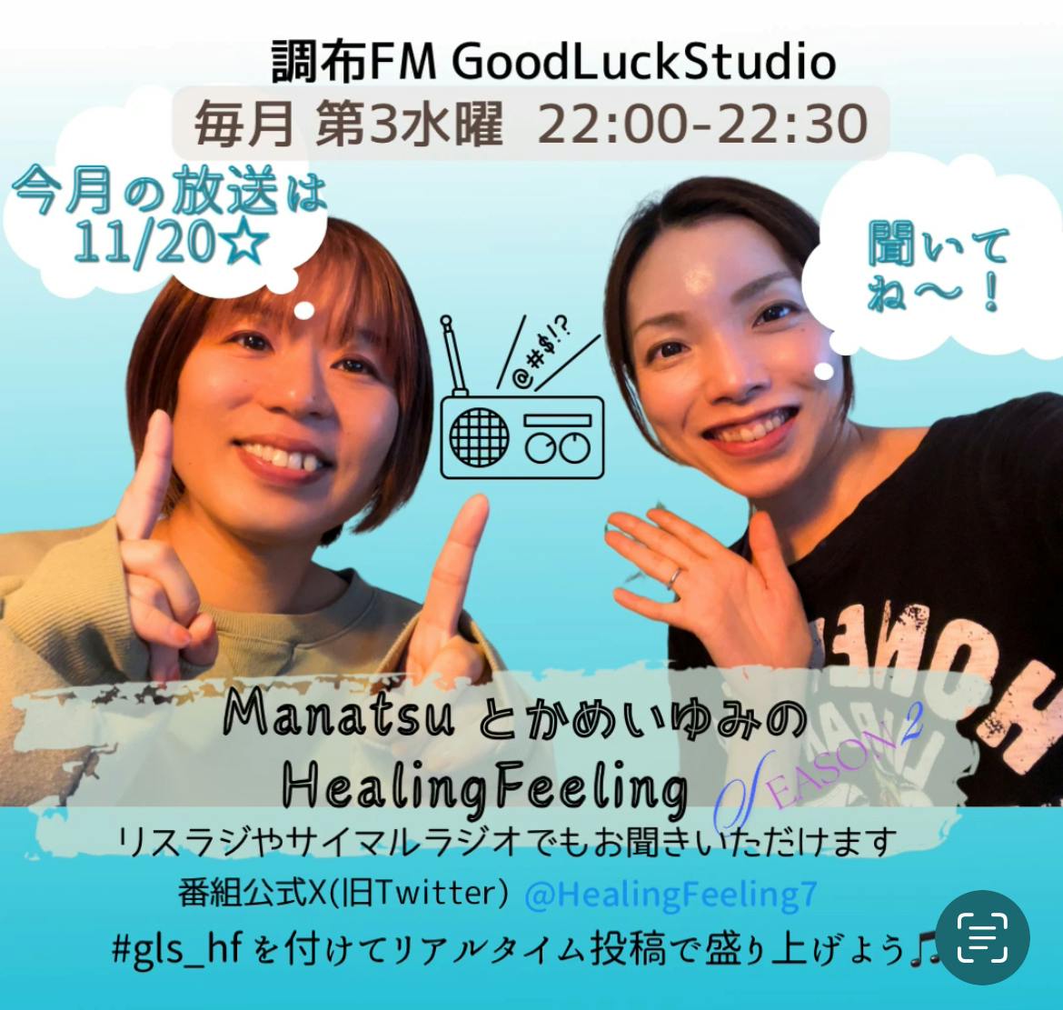 調布FM「GoodLuckStudio〜ManatsuとかめいゆみのHealingFeeling〜」の公式X(旧Twitter) @HealingFeeling7のフォローよろしくお願いします♪