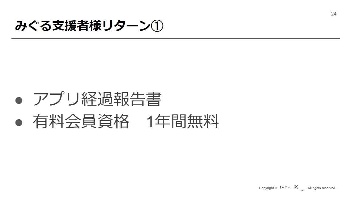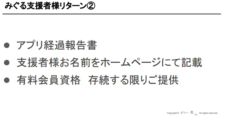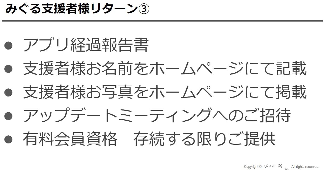 私たちは、みぐるアプリの開発が完了するまでの経過を1ヵ月に1度プラットフォームにてご報告いたします。また、感謝の気持ちとして、みぐるアプリの有料会員資格をサービスが存続する限りご提供させていただきます。