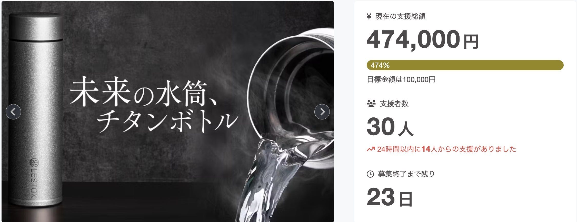 おかげさまでキャンペーン直後に目標金額を達成し、現時点では「474%」となりました。