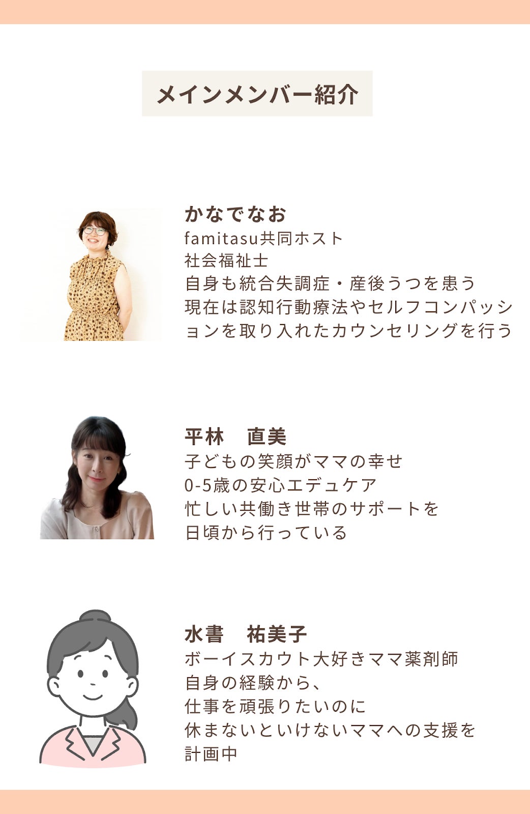 それぞれがママであり、子育て環境やメンタルヘルスの実情に疑問を感じているメンバーです。