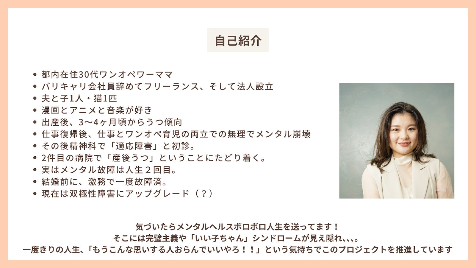 今回、このイベント実施に至ったのには、「なんで私は育休中に産後うつとわからなかったんだろう」という疑問が始まりでした。