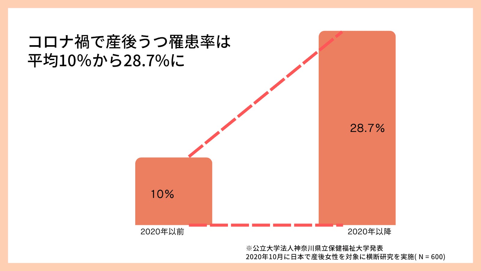 コロナ禍を経て、平均10% だった産後うつ罹患率は28.7%まで到達したというデータがあります。引用元:https://www.kuhs.ac.jp/shi/news/details_01448.html