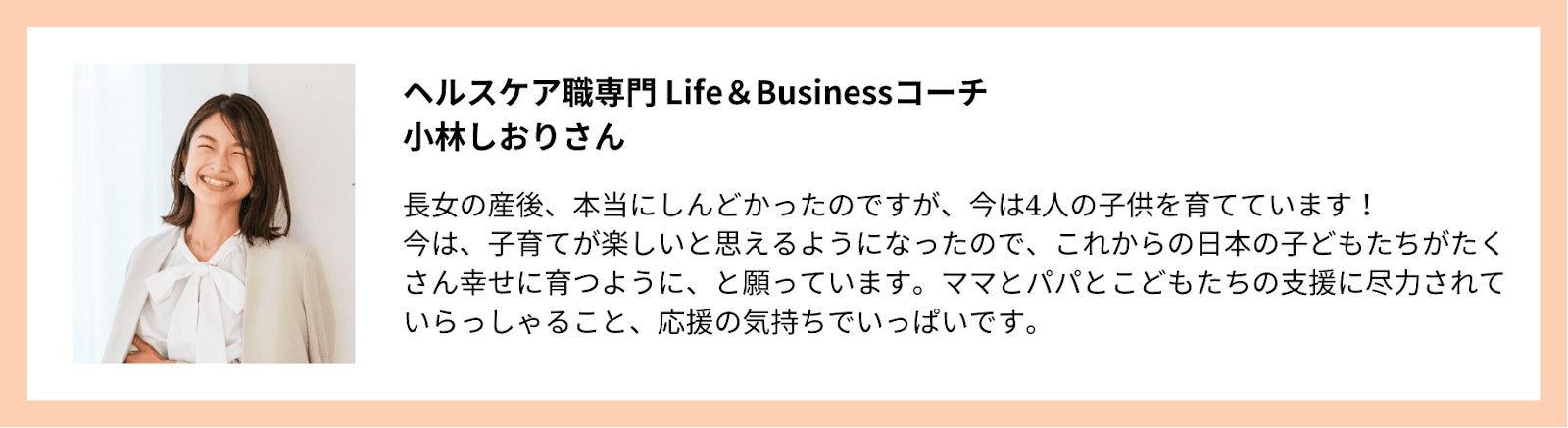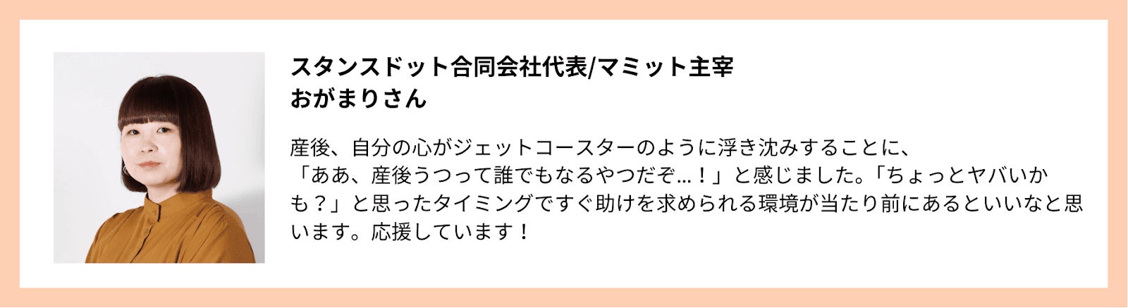 特に母親は、妊娠出産という身体的にもダメージの大きい体験の直後にワンオペ育児を強いられ、仕事も辞めるわけにはいかず、というどうにも苦しい状況の方が多いと考えています。