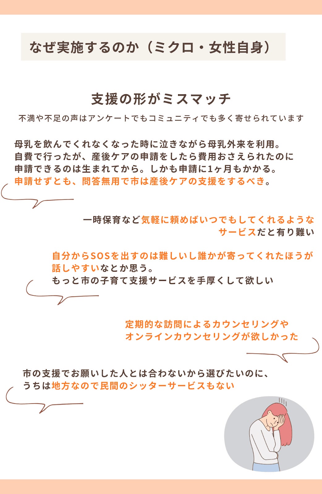 さらにアンケートでは、支援を必要としている人が、自ら言い出せなかったり、支援につながりにくかったり、実際に使っても仕組みが難しかったり、赤ちゃんを抱えたまま日々育児に追われている女性にはなかなかハードルが高い実態がわかってきました。