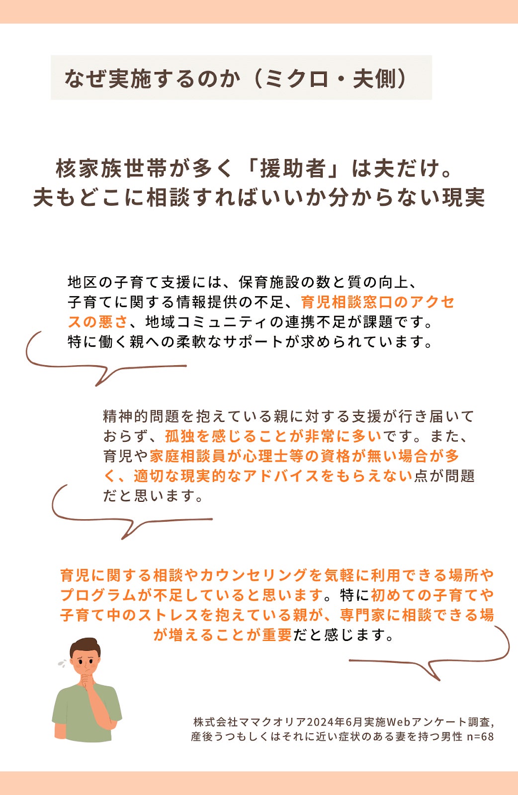 そこには「どこに相談したらいいのかわからない」「相談しても的確ではない」「支援にアクセスしにくい」という苦悩が見えてきました。ママの横でともに育児に取り組むパパも実は助けが必要な状況なのです。