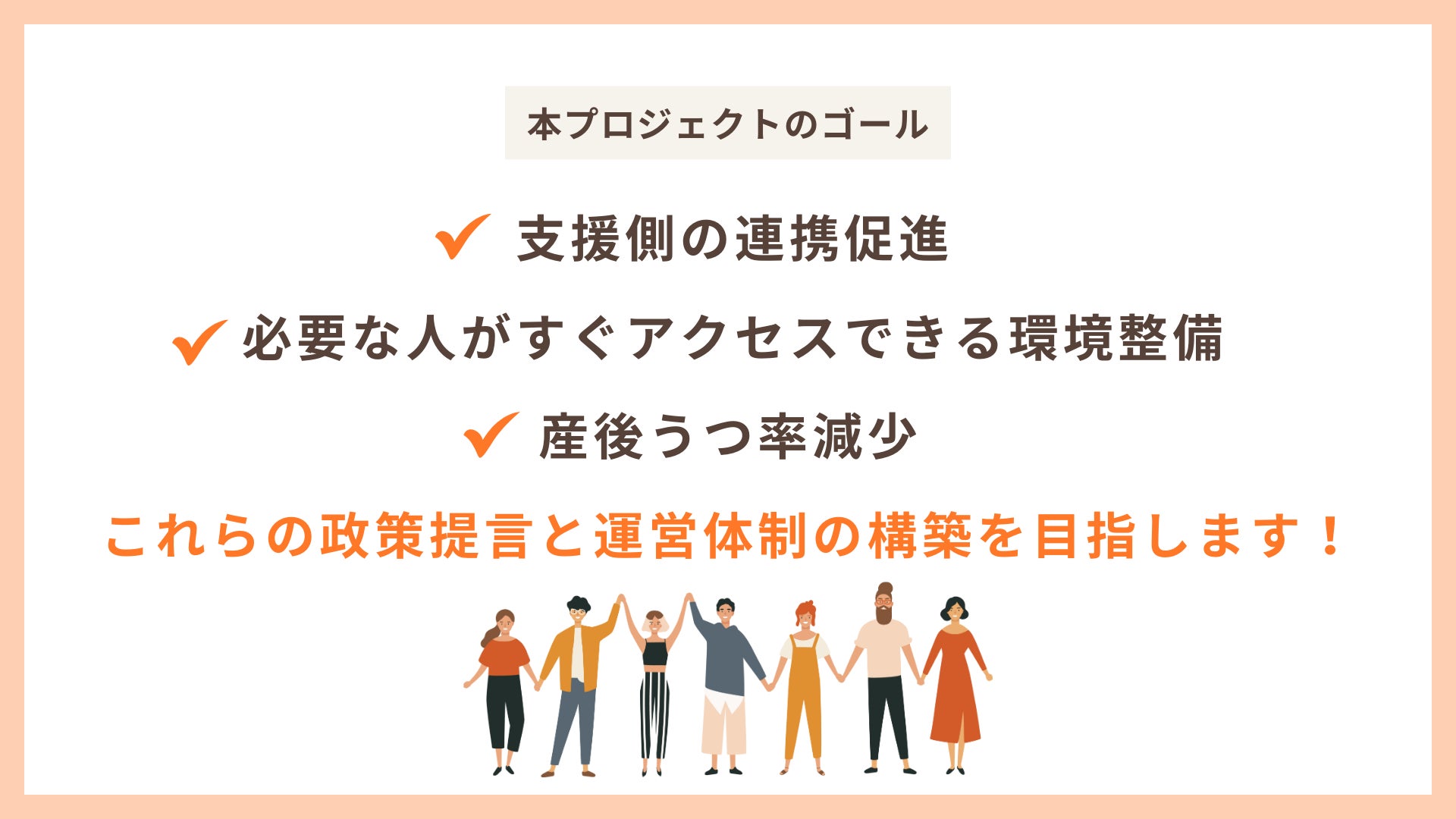 私たちの目的は、産後うつを減らし、苦しい子育てをなくすこと。