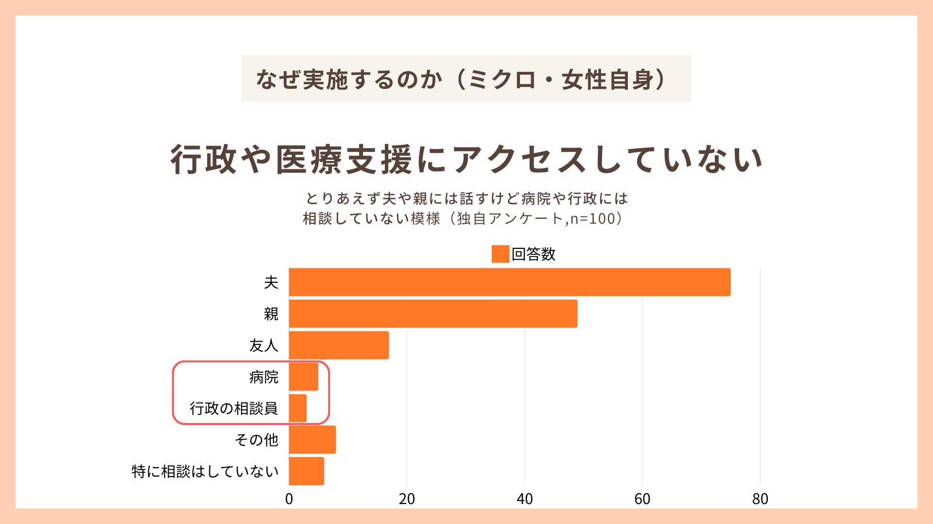 私たちは、何度か100名規模のWebアンケート調査をしました。そこでも、「行政や医療に相談をする」という数字は少なく不満や不足の声を多くいただいています。