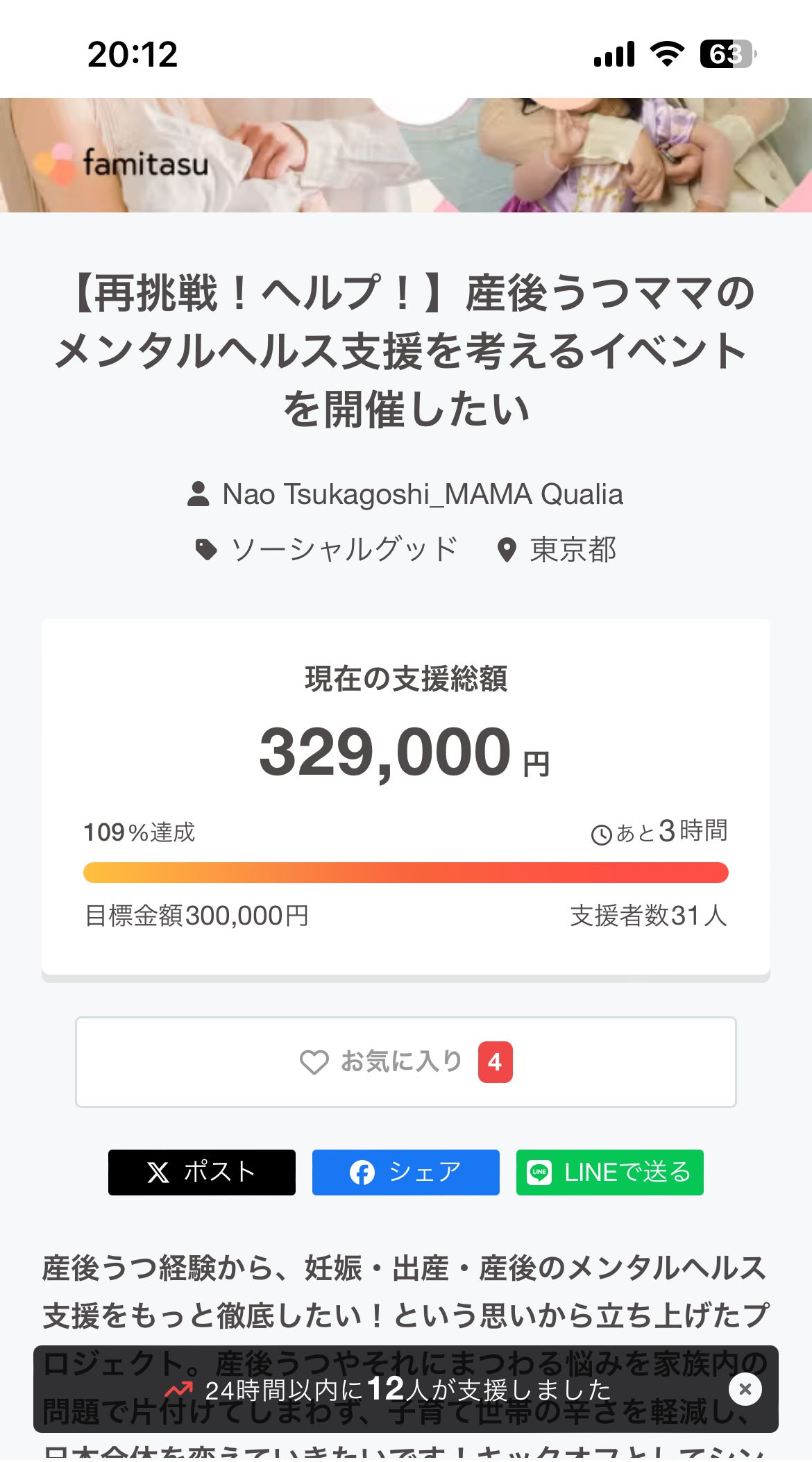 2024/09/19 21:05目標達成!!ご支援ご協力本当にありがとうございます!!前代未聞の1週間での勝負、毎日ヤキモキしながら、それでもやれることはやろう!!とやってまいりましたがおかげさまで、多くの方にご支援と拡散にご協力いただけて本日23:59締め切りを前にゴール達成できました!さらに達成後もどんどんご支援いただいており、「何が起こってるの〜!?」と自宅で大騒ぎしております。イベント参加者も100名が近づいてきました!東京だけでなく、オンラインで全国からご参加申し込みをいただいています。本当に感謝しかありません。今月29日、絶対に良いイベントにします!イベントは下記URLにてご確認ください。https://mamamentalhealth2024.peatix.com/みなさまどうか引き続きこの課題に関心を向けていただけますと幸いです。よろしくお願いいたします!代表 塚越 もっと見る