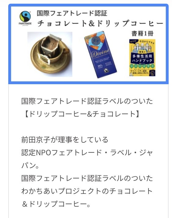 前田京子が理事をしております、認定NPOフェアトレード・ラベル・ジャパン。国際フェアトレード認証ラベルのついたわかちあいプロジェクトのチョコレートとドリップコーヒーのセットをご用意いたしました。