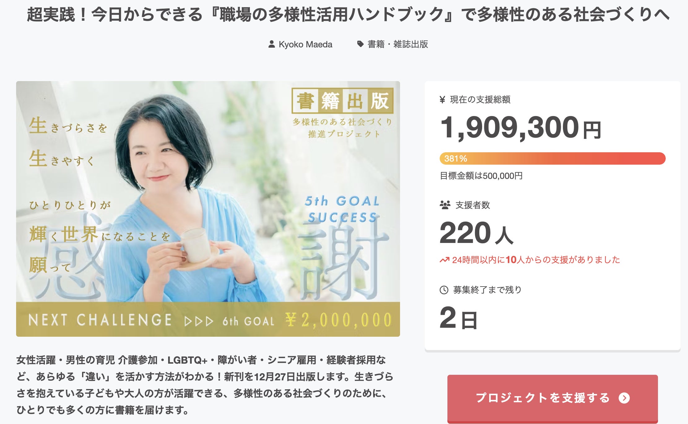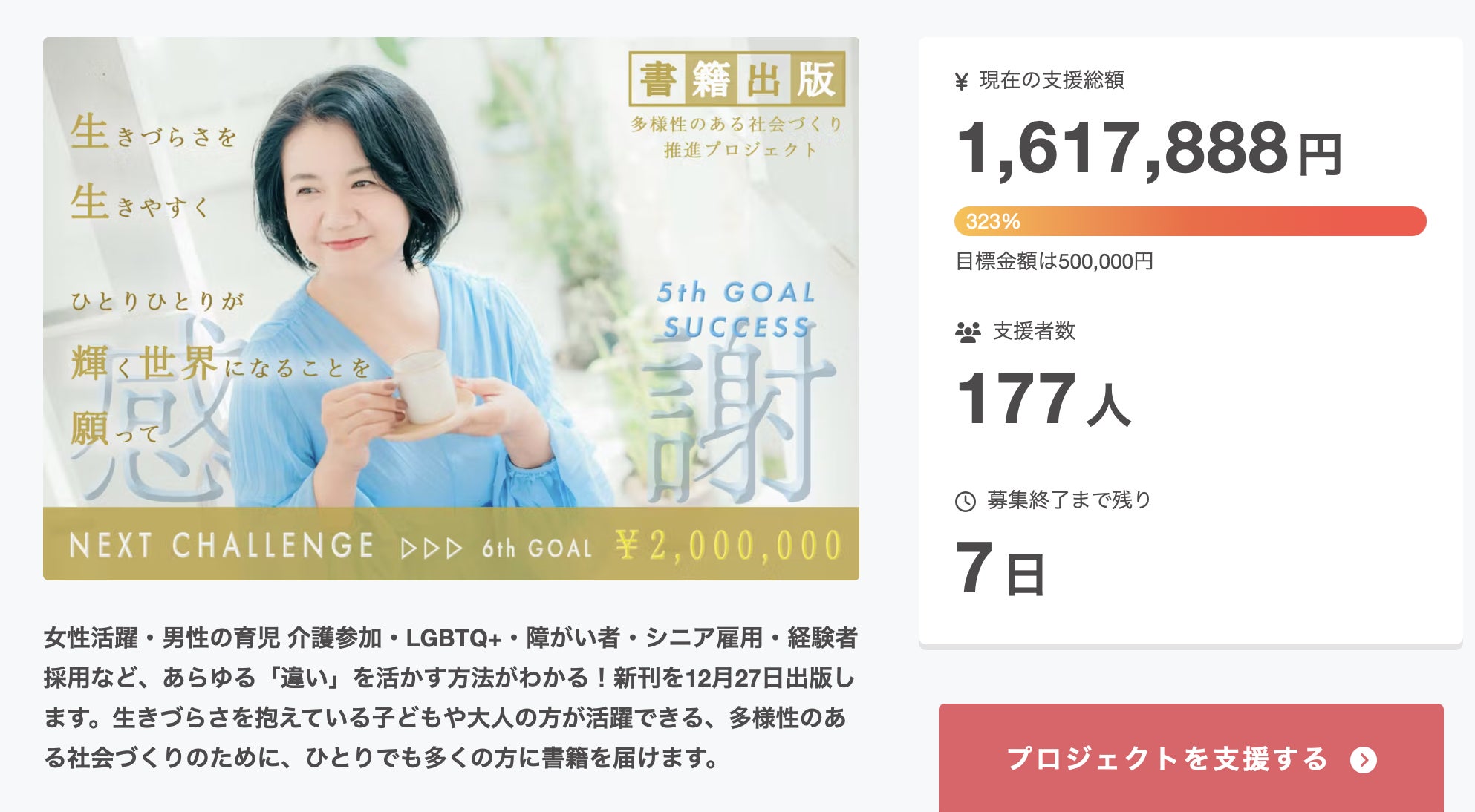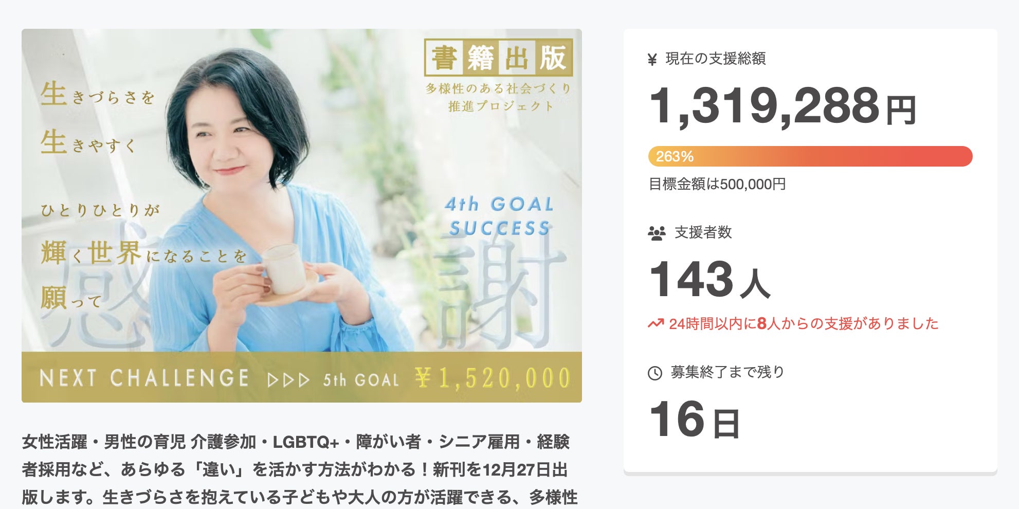 2024/12/15 19:56いつも応援いただき誠にありがとうございます!5thゴールの152万円達成いたしました。177名の皆さまご支援いただきありがとうございます。6thゴールは200万円です!ここから、まだまだ、多様性活用ハンドブックについて知っていただくために、皆様のお力が必要です。ーーーーーー「職場の多様性活用ハンドブック」と聞くと、「難しそう・私とは関係がない」と思う方もいるかもしれません。ですが、「自分はマイノリティ(少数派)だから、生きづらい」、と感じている人は、あなたのまわりにたくさんいます。もしかしたら私たち自身も、そう感じるものを、なにかしら持っているかもしれません。「いろんな人がいるからいいんじゃない?」 「一人ひとりの個性や強みを生かし、それらを最大限に活用することが、企業にとっても、1人ひとりにとっても、非常に重要なのだ!」「あなたは1人じゃない、応援してる人がたくさんいるんだ」という安心安全な社会を作りたい。生きづらさを抱えている人が、自分と人との違い・強み・素晴らしさを再確認して、その人らしく活躍してもらいたい。だから、まずはこの本の出版を通じて、少しでもより良い世の中に近づけたい!こんな想いで出版を決めました。「どうか、クラウドファンディングのページをシェアしていただけないでしょうか。」超実践!今日からできる『職場の多様性活用ハンドブック』で多様性のある社会づくりへhttps://camp-fire.jp/projects/790766/view?utm_campaign=cp_po_share_c_msg_mypage_projects_showーーーーーー もっと見る