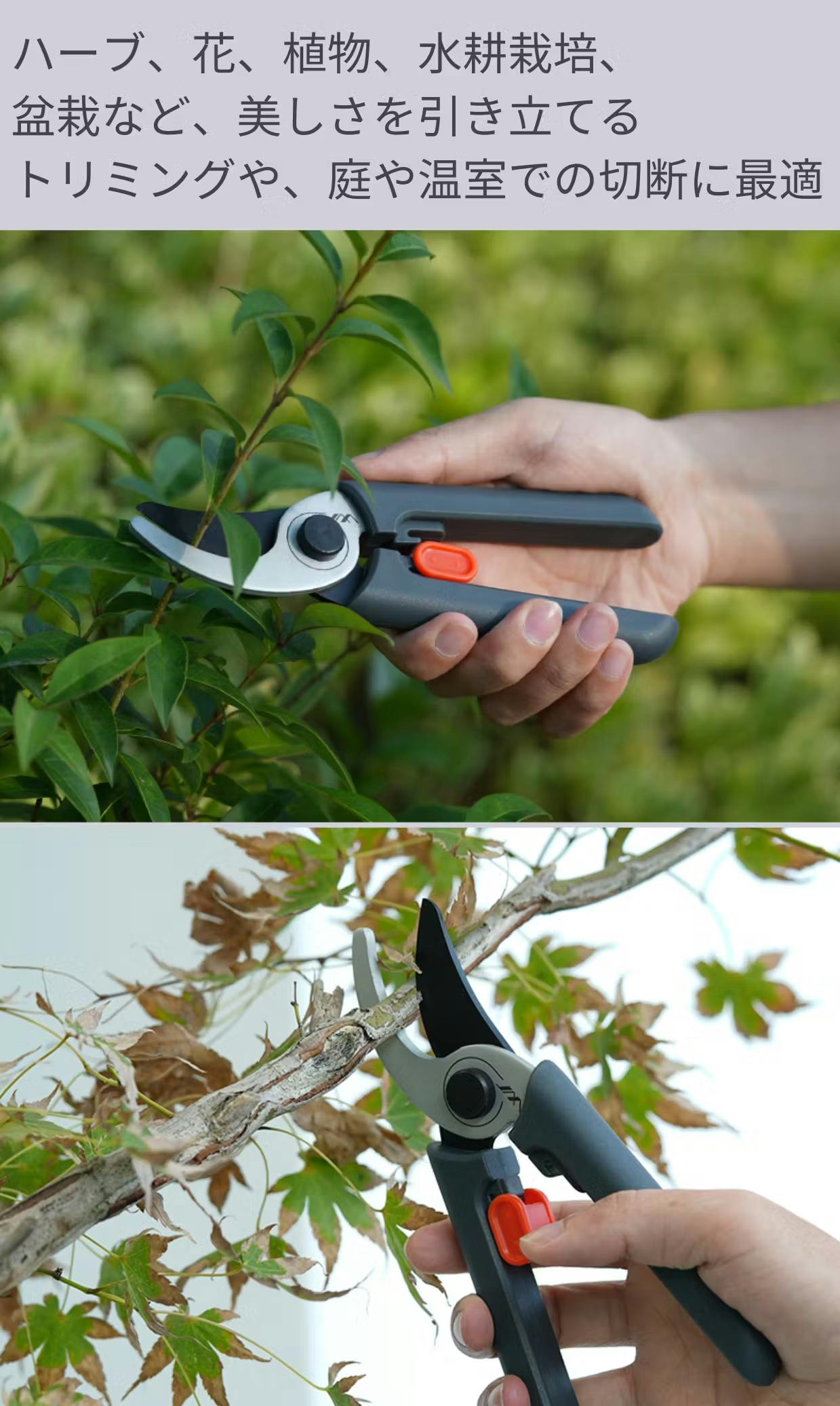 JM Gardening Tool W201とW202は、家庭菜園や造園に最適な高性能な剪定ばさみです。SK5炭素鋼刃による優れた切れ味と耐久性を活かして、あなたのガーデニングライフを一層充実させてみてください。これらのツールを使って、美しく手入れされた庭を手軽に維持しましょう。