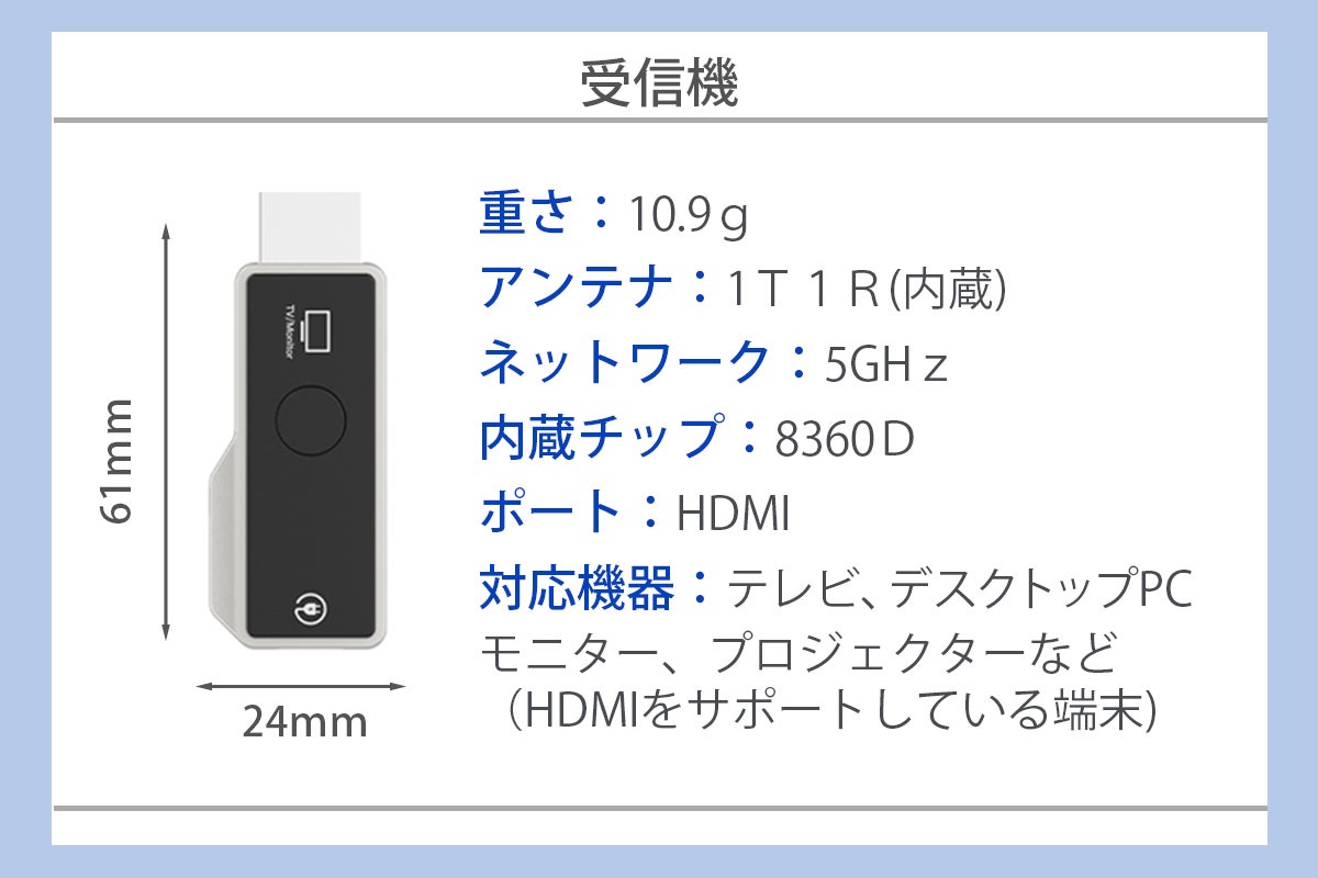 ごちゃつきがちなケーブルを必要とせず、ノートパソコンやスマートフォンなどの端末からテレビやプロジェクターなどの大画面へ簡単に映像が転送できます。