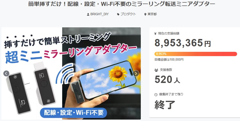 ご支援者様、簡単挿すだけ!配線・設定・Wi-Fi不要のミラーリング転送ミニアダプターにご興味をお持ちいただきありがとうございます。プロジェクト開始から43日目で520人ものご支援者の方々より支援頂き、無事プロジェクト終了を迎えることが出来ました。早速皆様のリターンを2025年09月末にお届けできるよう準備を始めております!皆様にご満足いただけるリターンをお届けできるよう、全力で取り組んで参りますので引き続き、「簡単挿すだけ!配線・設定・Wi-Fi不要のミラーリング転送ミニアダプター」をよろしくお願い致します。BRIGHTチーム