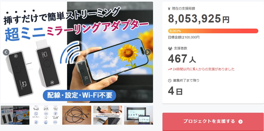 この度は「簡単挿すだけ!配線・設定・Wi-Fi不要のミラーリング転送ミニアダプター」に支援頂き、ありがとうございます!お陰様で、支援総額800万円達成することができました。【ミラーリングアダプターとは?】スマホやデバイスに挿すだけで簡単にミラーリングできる!必要な手順は初回のペアリング1回だけ!面倒な設定や複雑な操作、アプリのインストール等も必要ありません。充電しながらのミラーリングも可能です。ご興味のある方、ぜひ支援お願い致します。https://camp-fire.jp/projects/790816/viewBrightチームは、当プロジェクトをもっと多くの方に知っていただきたいと考えております。よかったら、FacebookやTwitter等のSNSでのシェア・拡散をお願い致します。#brightdiyどうぞよろしくお願い致します。Brightチーム