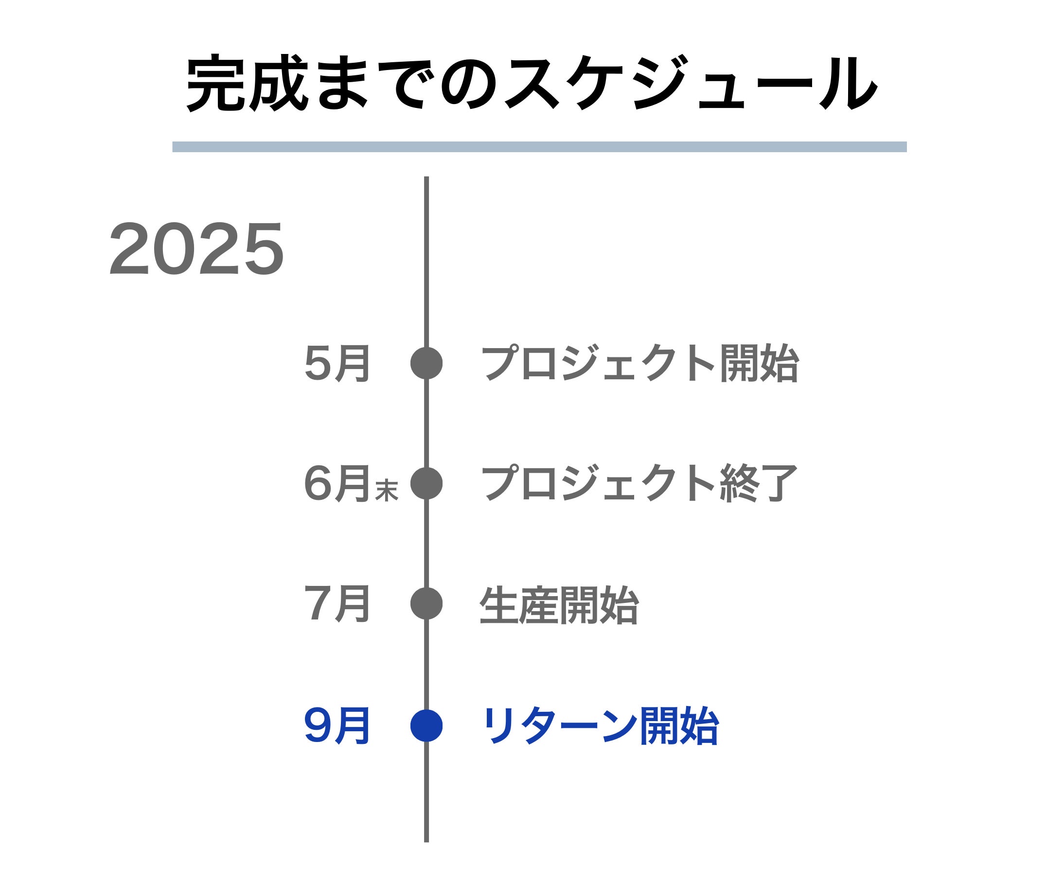 ※本文中に記載させていただいたスケジュールは、あくまでプロジェクト公開時点の予定です。クラウドファンディングの性質上、配送遅延のおそれがございます。