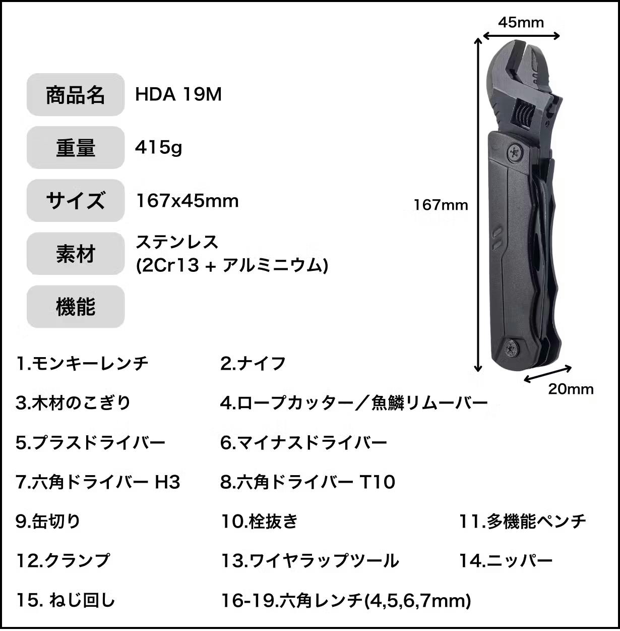 新たに多機能ペンチが加わってバージョンアップ!アウトドア、キャンプなどのレジャーだけでなく、災害時や日常DIYでも大活躍なツールを集めたコンパクトな多機能マルチツールレンチ【マルチツール 19D】です!