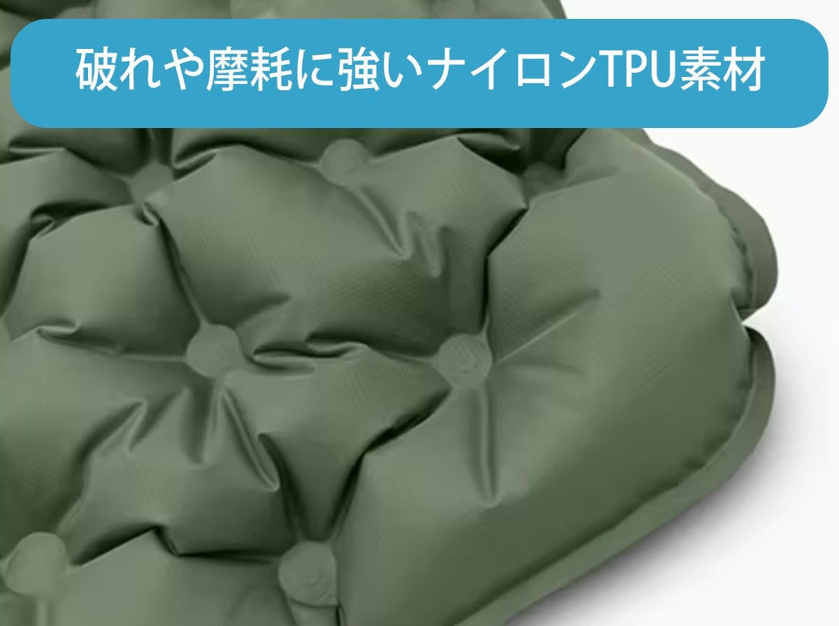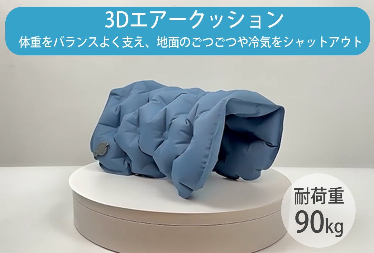 屋内・屋外問わずにとこでも座れるエアクッション。ケースがポンプになるので膨らませるのもたたむのも簡単です。口で膨らませる必要がないので衛生的、かつクッション生地じたいも耐摩耗・耐破れ・防水機能が備わっており、ゴツゴツした場所の多いアウトドアでも長くお使いいただけます。