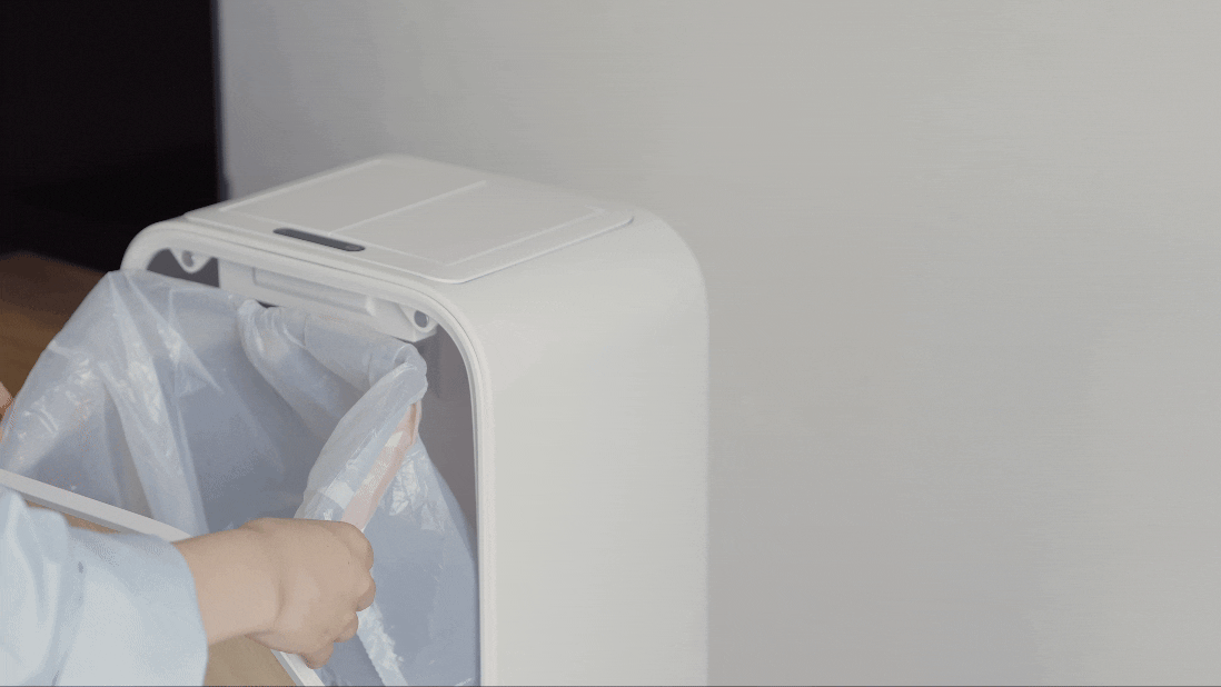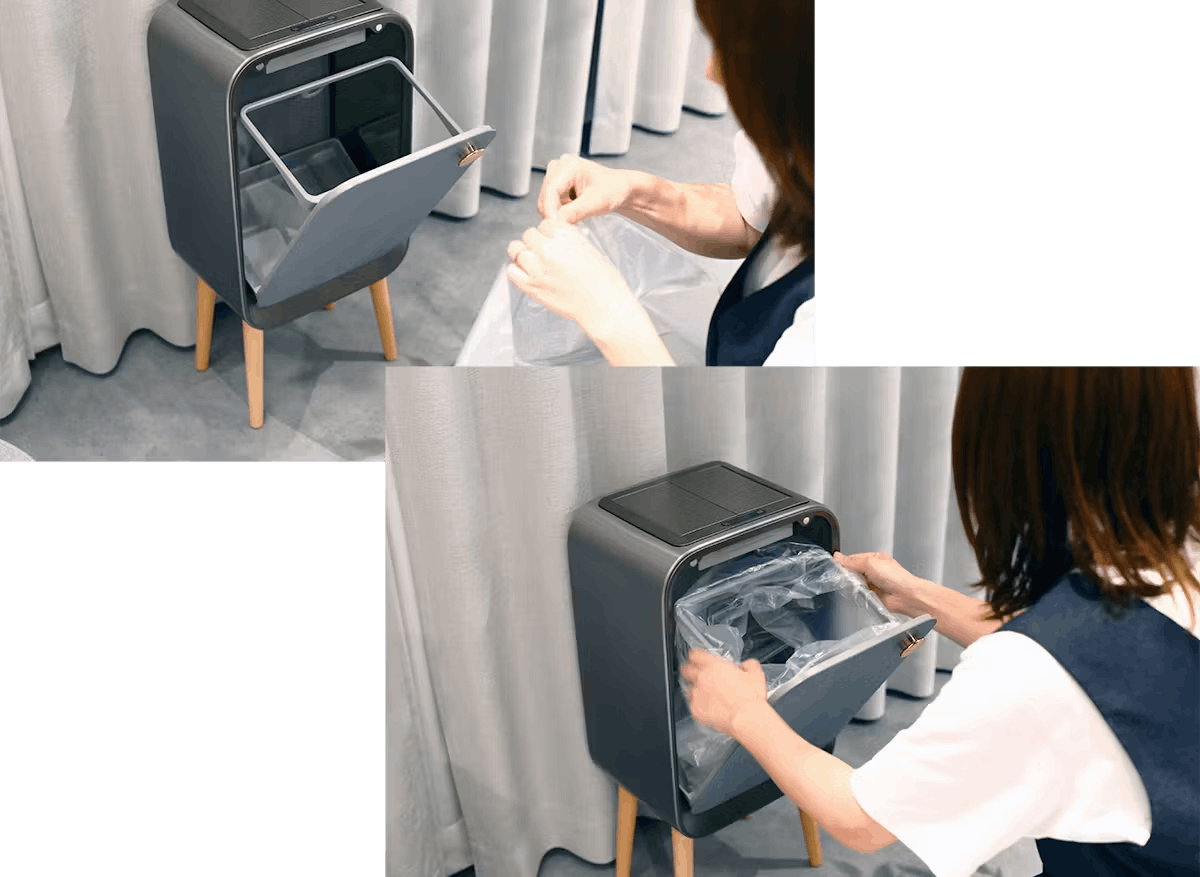 使いやすさにもこだわりました。ゴミ袋の付け外しは、取っ手を持って開けて設置するだけ。誰でもストレスなく交換できます。
