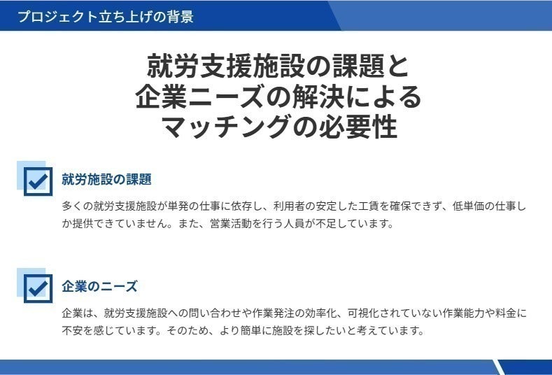 今回、今までの当社の事業を通じて感じた就労支援施設の抱える課題と、日本社会が抱える人手不足を解消できるプロジェクトを実現したく、皆様の応援をお願いいたします!