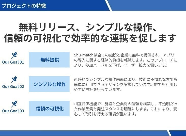 「Shu-match」は完全無料でリリースし、すべての就労支援施設と企業が簡単に利用できるようにします。全国2万ヶ所の就労支援施設と企業にまずは使ってもらうことが目的です。