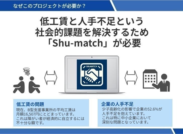 「Shu-match」は、この双方のニーズを効率的に結びつけ、障がいのある方々の経済的自立と社会参加を促進すると同時に、企業の人手不足解消を支援します。