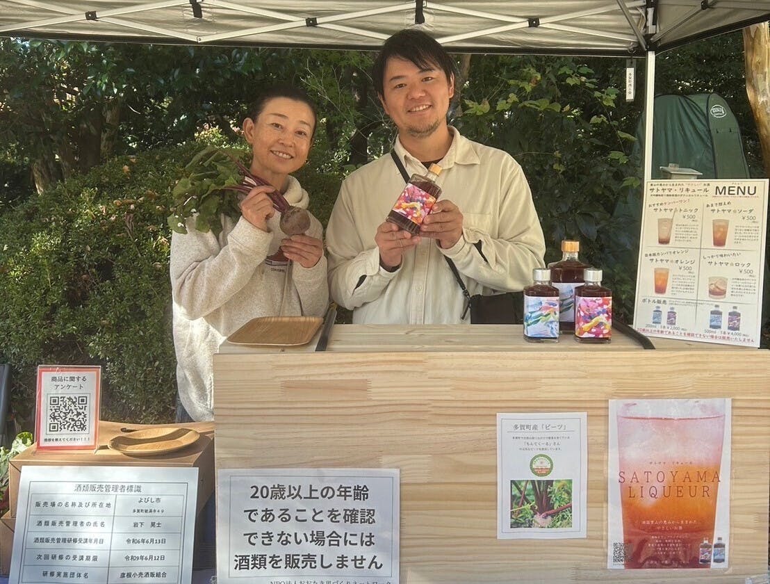 11/24地元多賀町の「胡宮神社(このみやじんじゃ)」社務所にて開催された「よびし市」に出品させていただきました。会場にはサトヤマ・リキュールの主原料として使用している「ビーツ」を提供いただいている合同会社もんてくーるの神鳥幸さんがいらしてくださり、ビーツを持っていただいての記念撮影。もんてくーるさんは、農薬不使用で野菜栽培にチャレンジしておられる団体で、里山のやさしさの提供を実践されています。もんてくーるさんの活動については https://youtu.be/cXLOCz2TPAs?si=lDr23yH71e-mut1w をご覧ください!