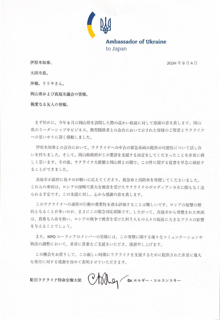この度、駐日ウクライナ特命全権大使 Dr.セルギー・コルスンスキー閣下より、NPO法人ユーラシアの支援活動に対して、理事長 沖 佳則と理事 バビィ リリヤ宛に感謝状をいただきました。これは、私たちの活動がウクライナの方々にとって重要なものであることを示すものであり、大変光栄に思います。